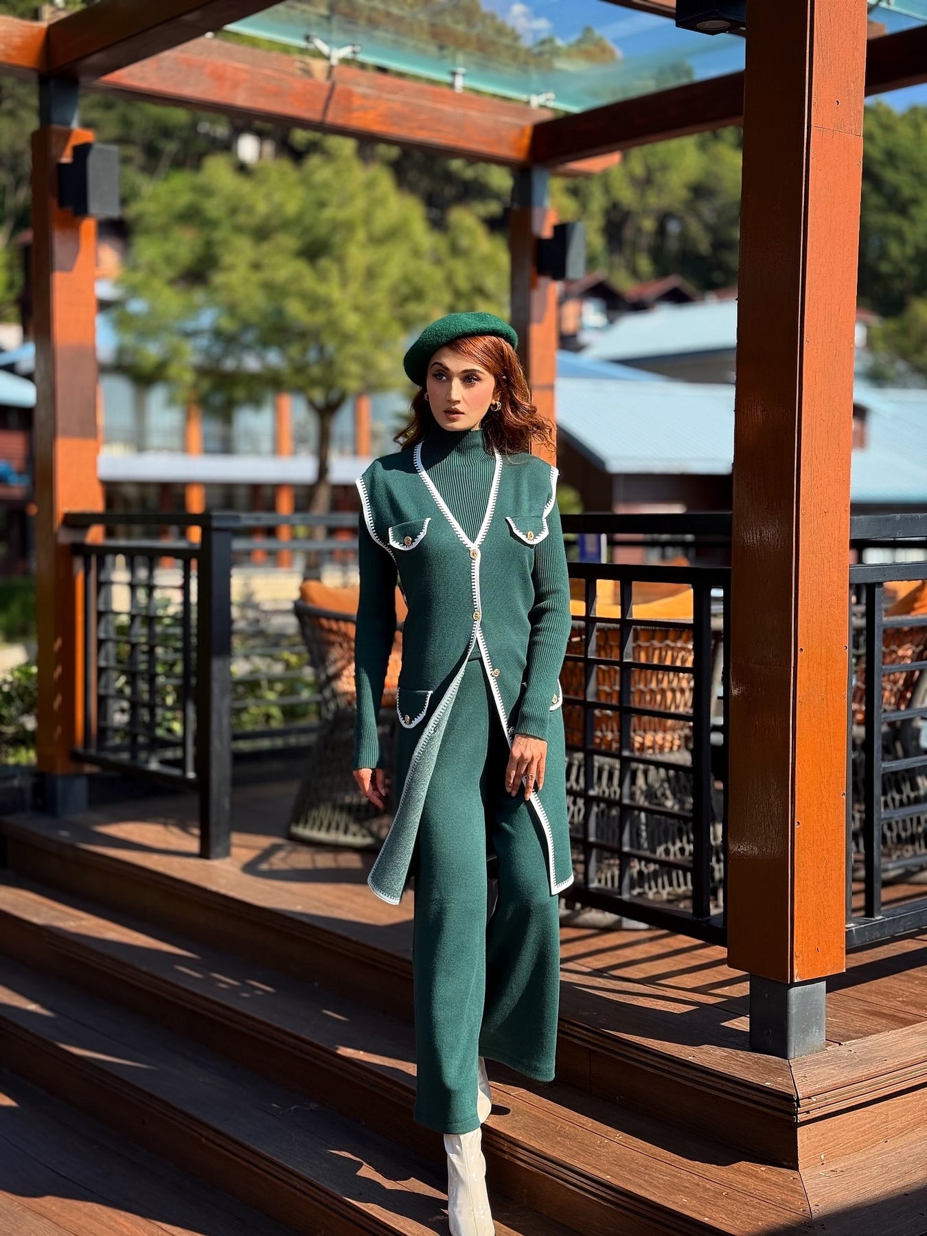 Our solid luxury three-piece set featuring a coordinated top and a knitted vest and pants is for sure a show stopper. Tracksuits are all-year round-the-clock best sellers. The knitting pattern and the vest add a touch to the aesthetics of the overall look.