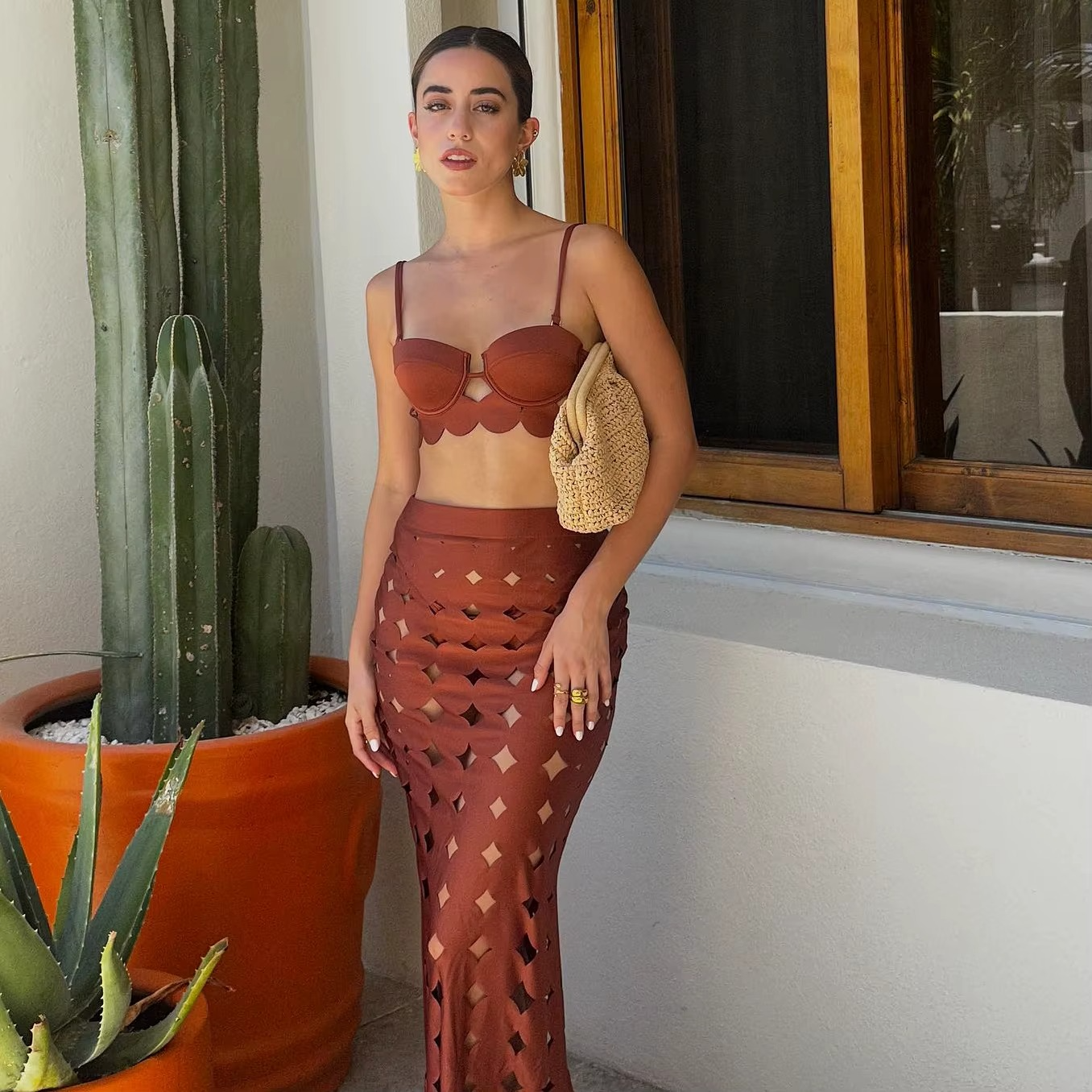 Our three-piece printed laser cut resortwear set including a cover-up sarong, bikini , and swimming shorts with laser cut detailing are a must-add outfit to your beach or swimwear. From a day at the beach or a pool party, our swimming suit set just adds a touch to the aesthetics of the overall look.
