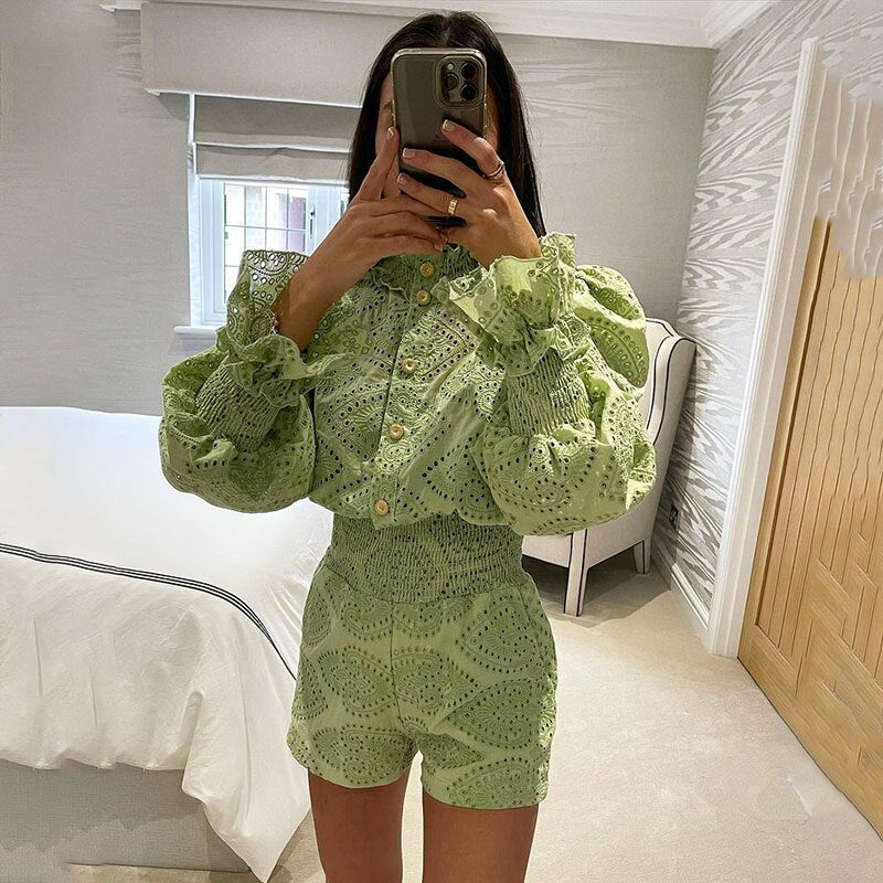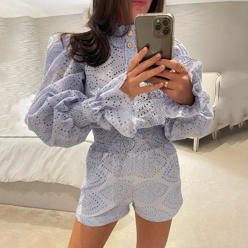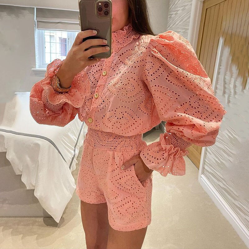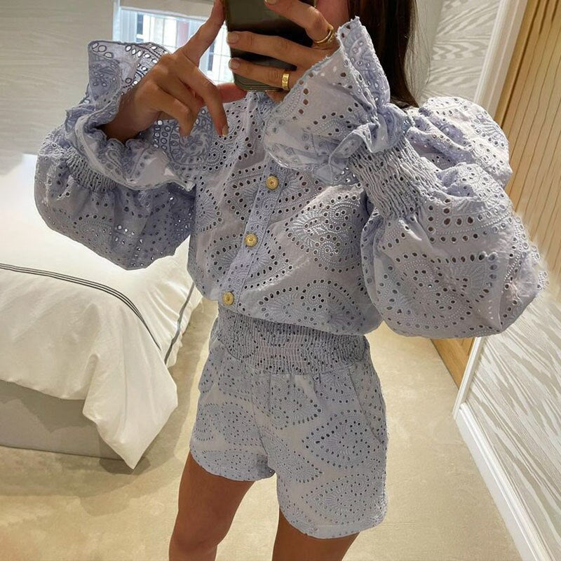 Our short top set featuring a hollow-out pattern and Puff Sleeves is for sure a show stopper. Hollow-out Sets are all year-round clock best sellers. From a day occasion, tonight's get-together, the hollow-out pattern and Puff Sleeves just add a touch to the overall look's aesthetics.