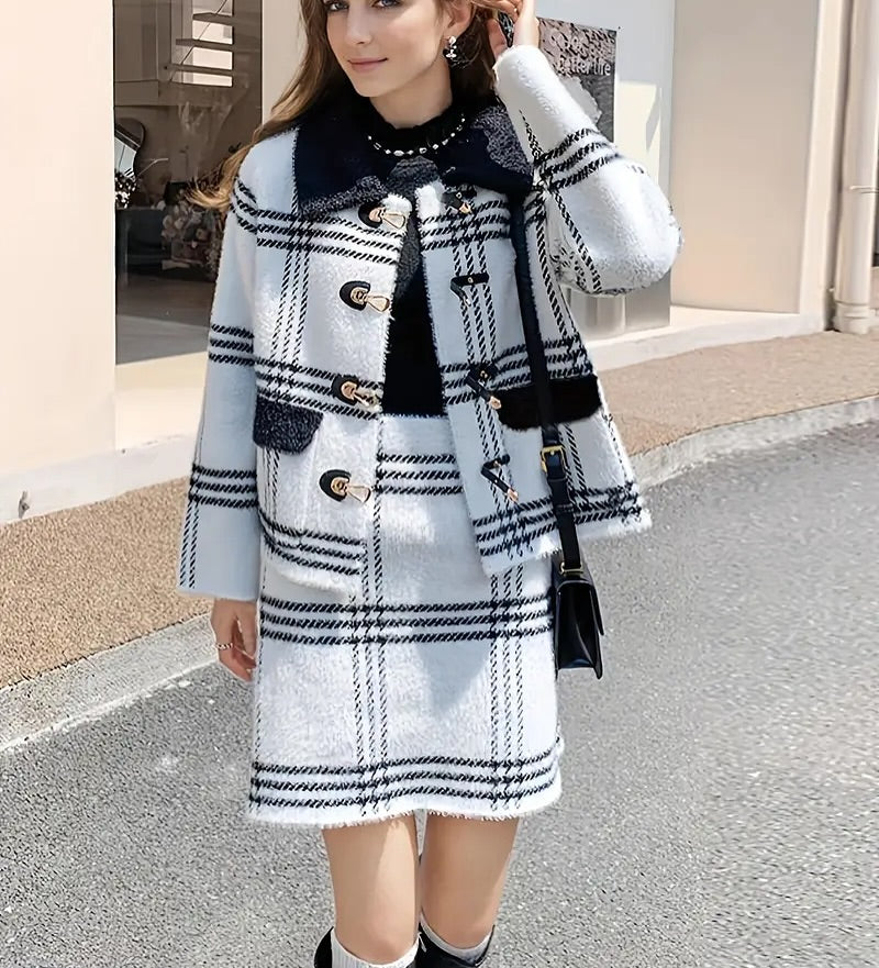 Our plaid coordinated set with high waisted mini skirt and coordinating tweed blazer with embelished button detailing is for sure a show stopper. Co-ord sets are all-year round-the-clock best sellers. From a day occasion to a night get-together, the plaid pattern just adds a touch to the aesthetics of the overall look.