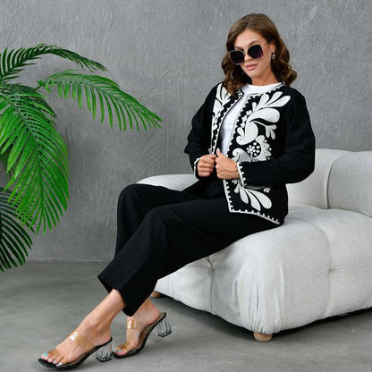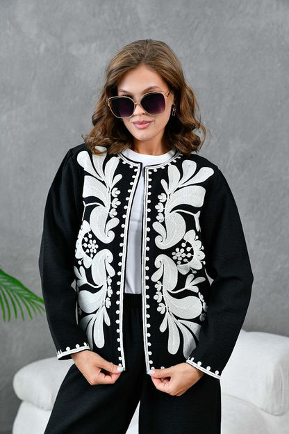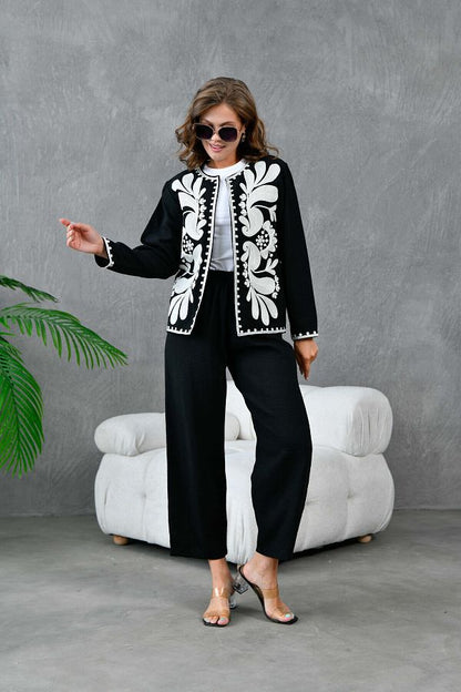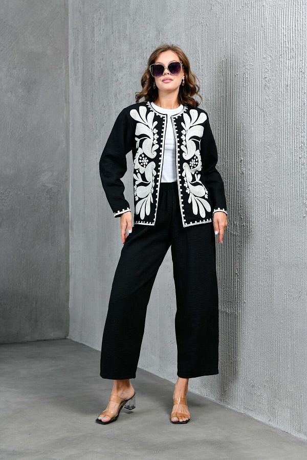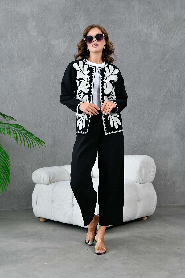 Our solid track set featuring wide-legged pants and cardigan featuring embroidered modern floral pattern is for sure a show stopper. Tracksuits are all-year round-the-clock best sellers. The ribbed pattern adds a touch to the aesthetics of the overall look.