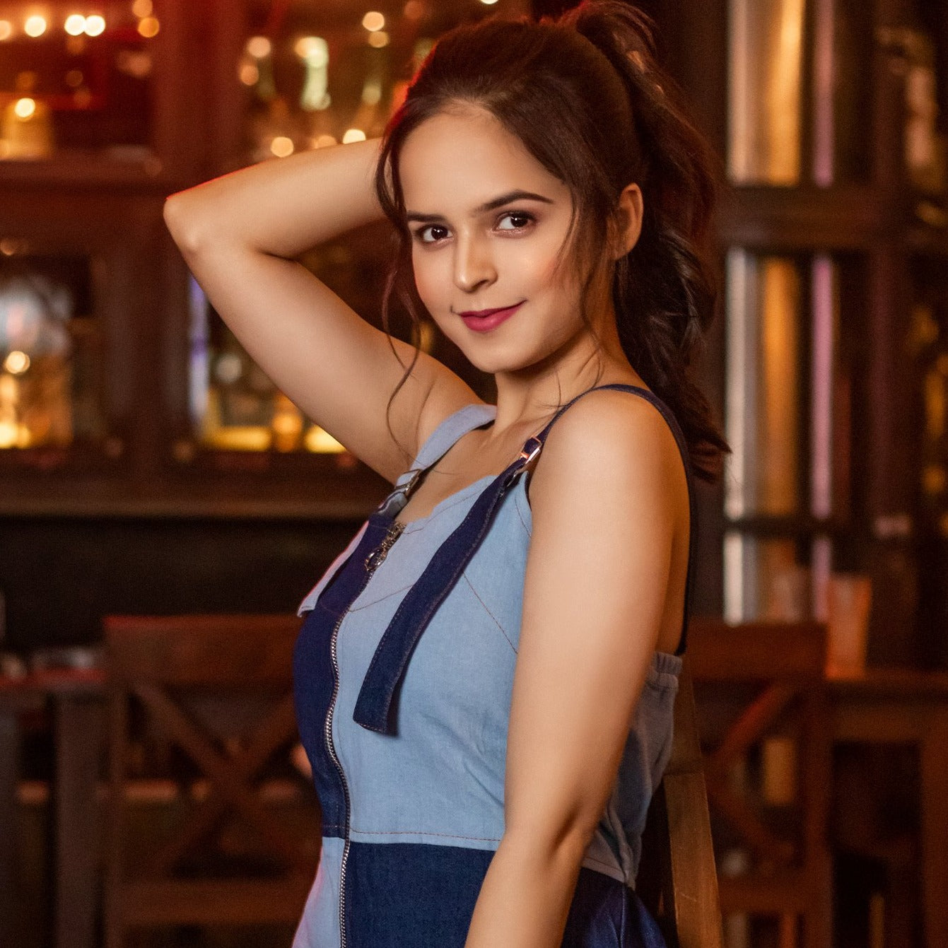 Our two-tone wide-legged denim jumpsuit with front zipper is for sure a show stopper. jumpsuits are all year round the clock best sellers. From a day occasion to night get together, a zipper detailing and buttons just adds a touch to the aesthetics of the overall look.