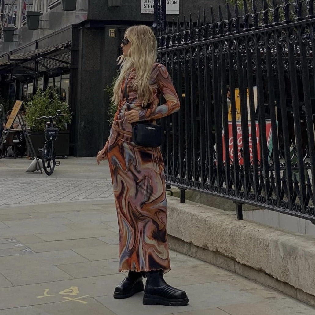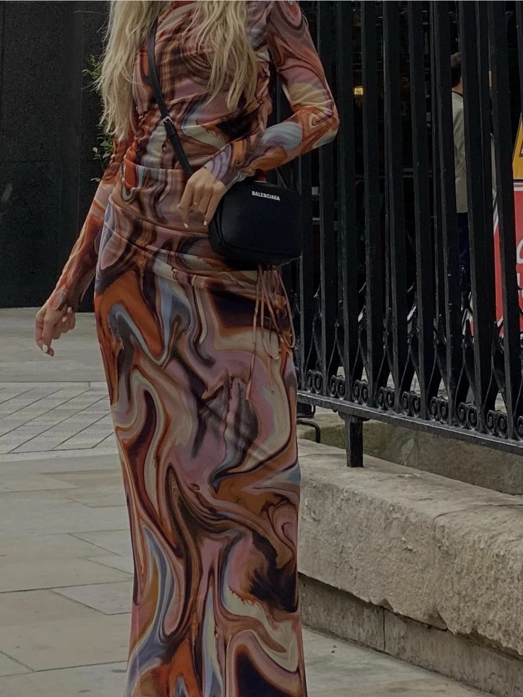 Our mesh two-piece set including a mesh top and a high waisted A-line vintage Skirt featuring a tie-dye fabric is a must-add outfit to your wardrobe. From a day occassion to a get event, our tie-dye mesh set just adds a touch to the aesthetics of the overall look.
