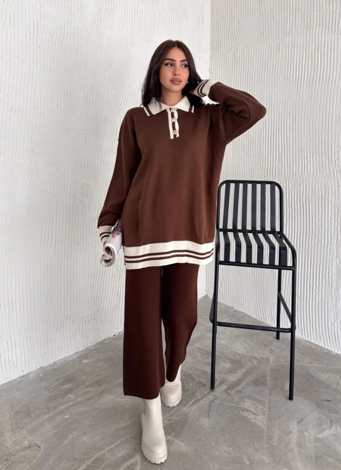 Our solid track set featuring wide-legged pants and long sleeves, button down collar Woolen Sweater is for sure a show stopper. Tracksuits are all-year round-the-clock best sellers. The ribbed pattern adds a touch to the aesthetics of the overall look.