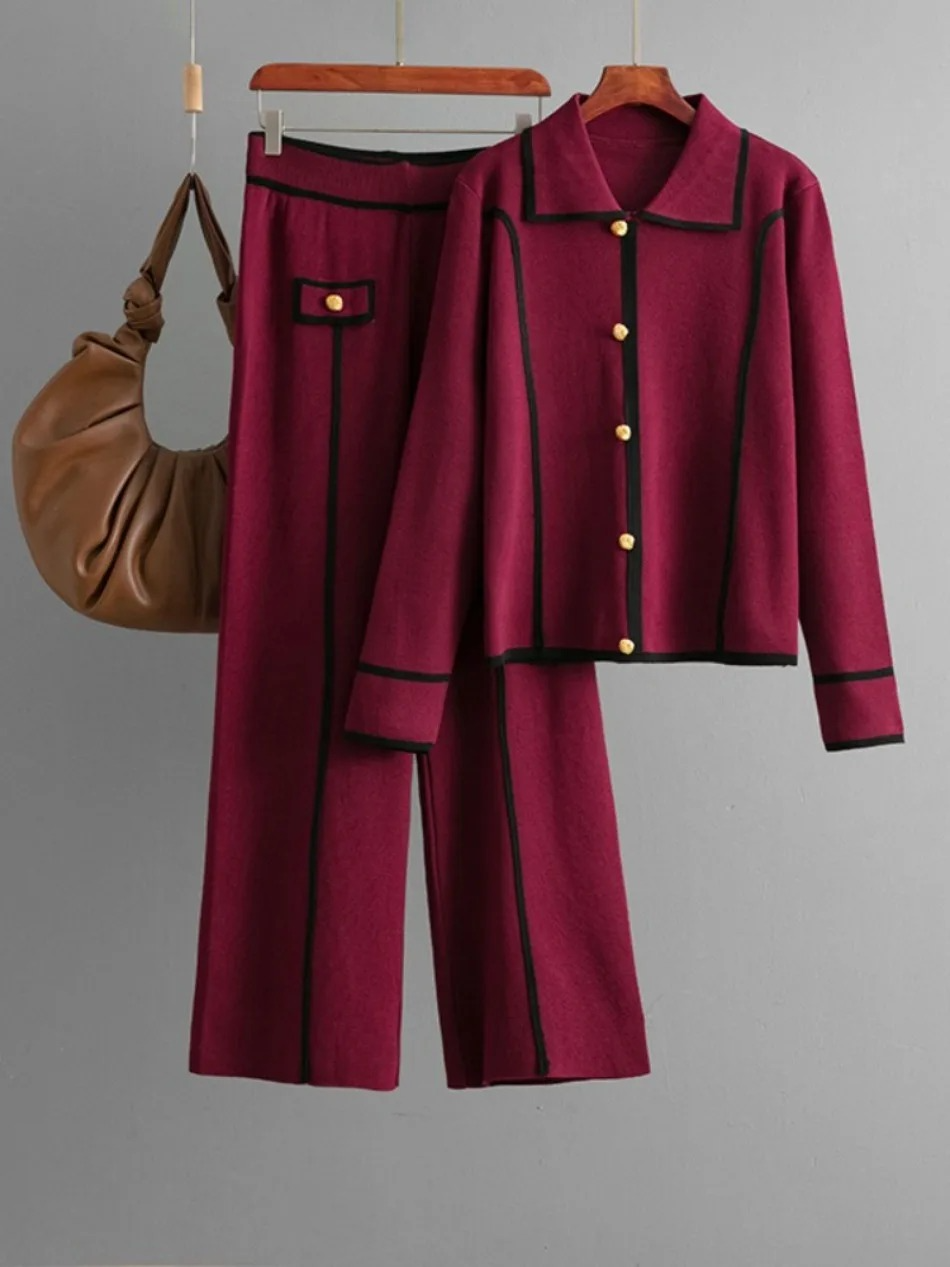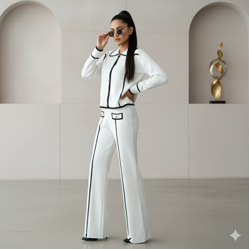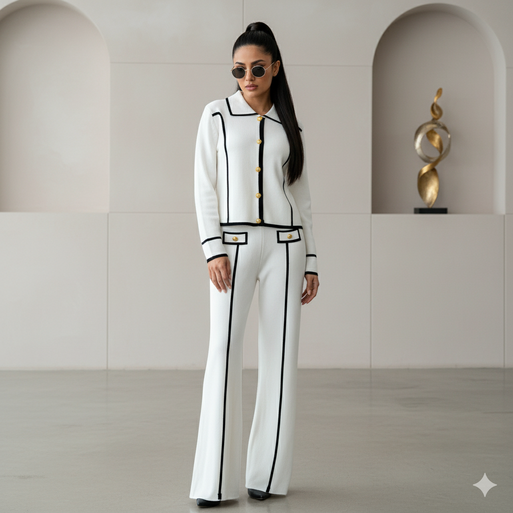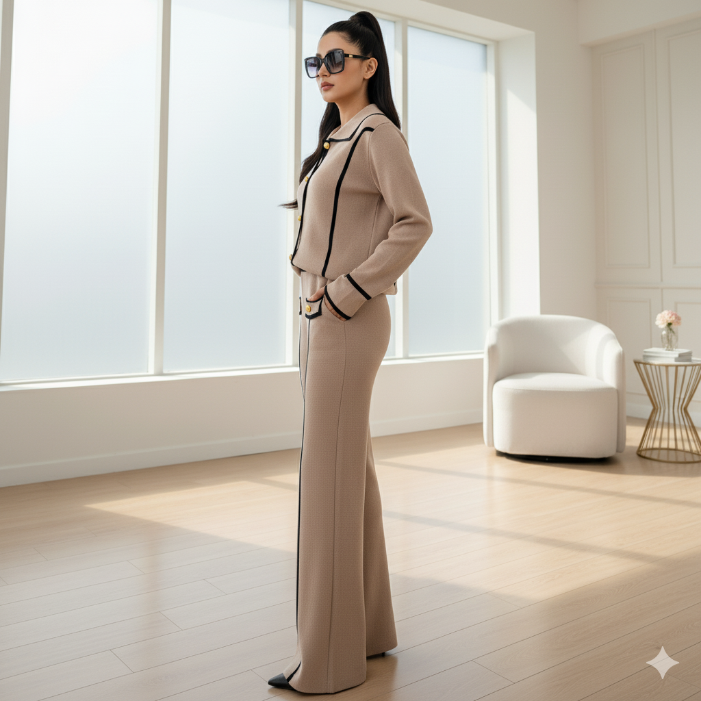 Our knitted Coord set with embellished buttons detailing, featuring asymmetric full sleeves vest and wide leg pants in pure winter friendly fabric. COORD SETS are all year round clock best sellers. From a day occasion, tonight's get-together, the boho style, button detailing on the cardigan, and striped wide-legged pants just add a touch to the overall look's aesthetics.