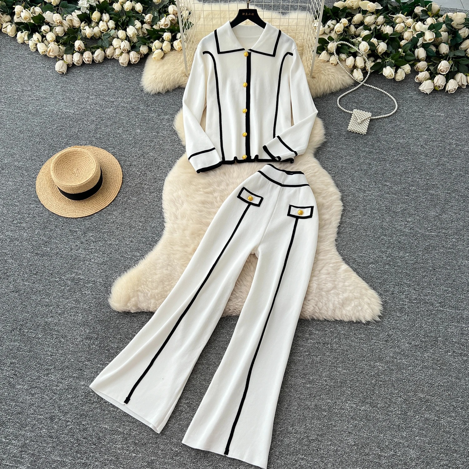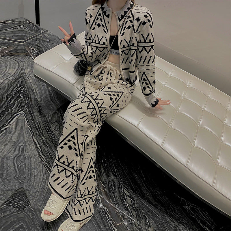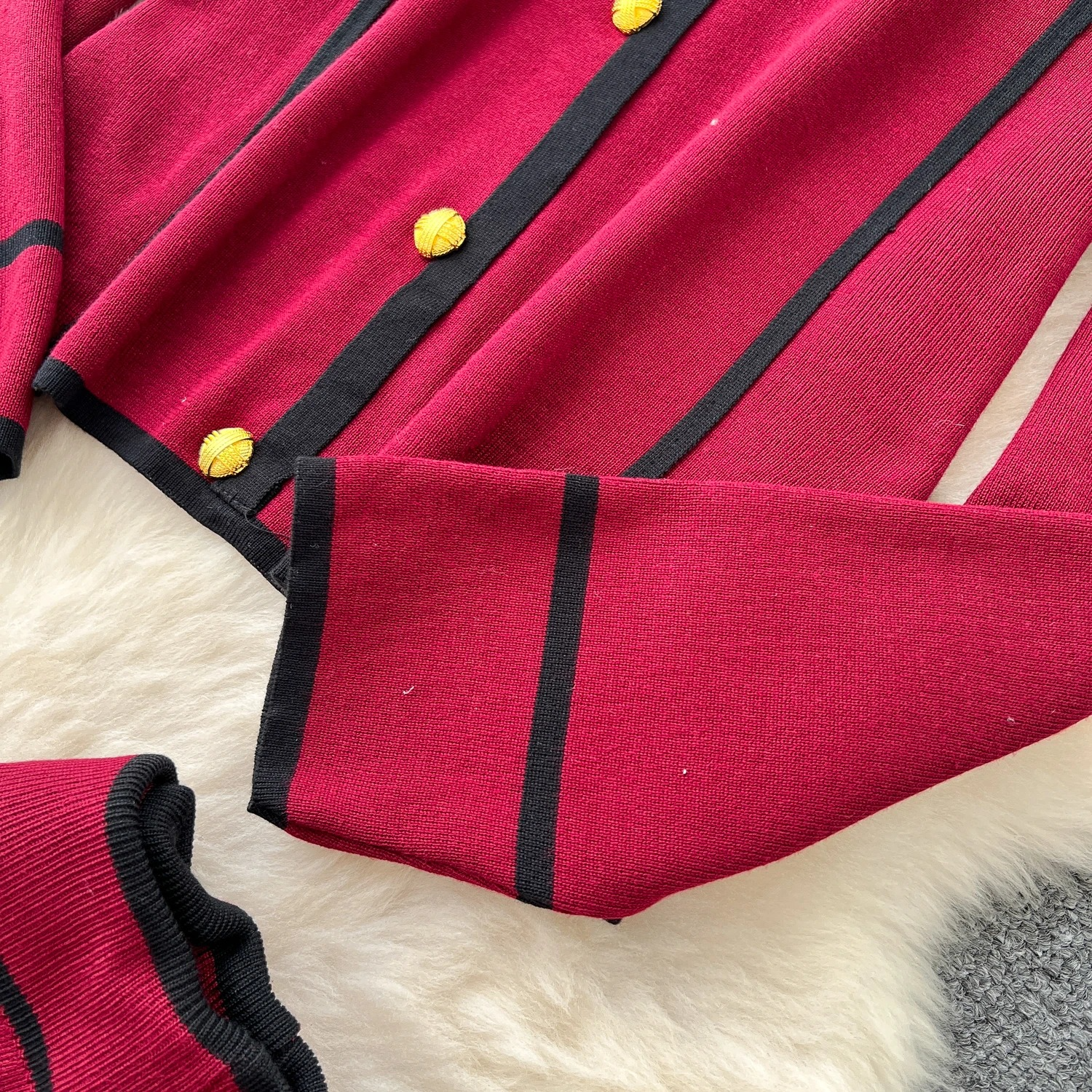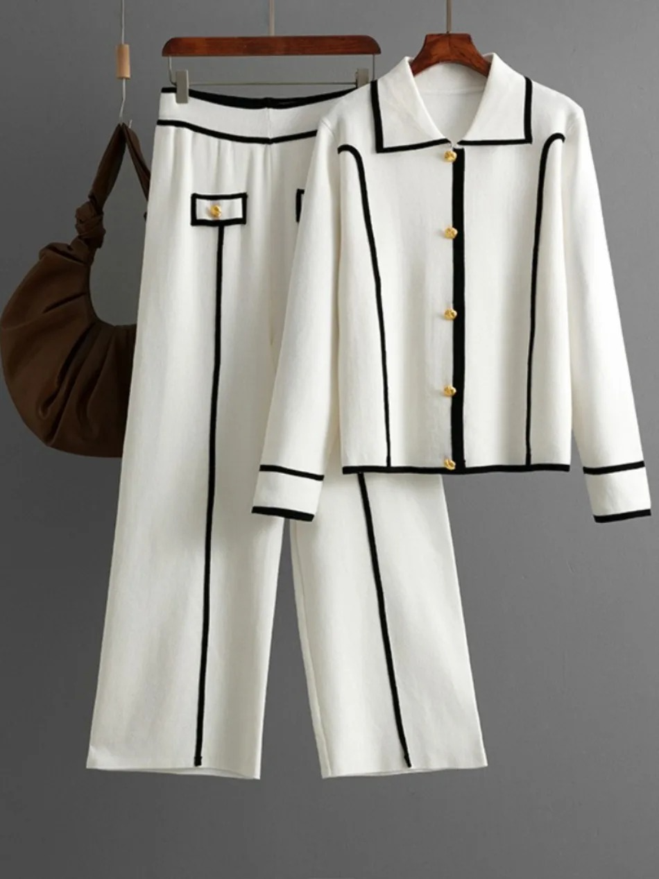 Our knitted Coord set with embellished buttons detailing, featuring asymmetric full sleeves vest and wide leg pants in pure winter friendly fabric. COORD SETS are all year round clock best sellers. From a day occasion, tonight's get-together, the boho style, button detailing on the cardigan, and striped wide-legged pants just add a touch to the overall look's aesthetics.