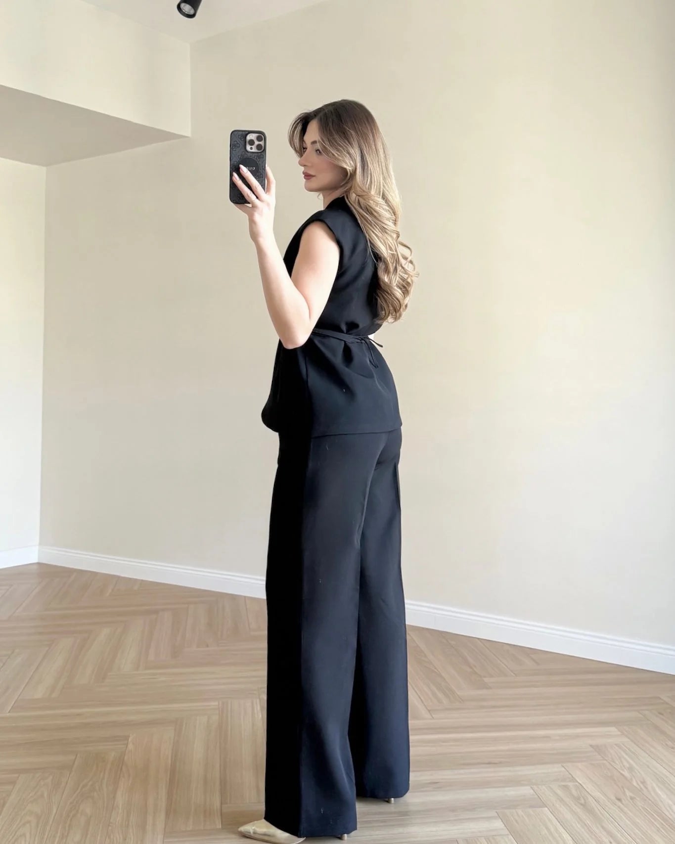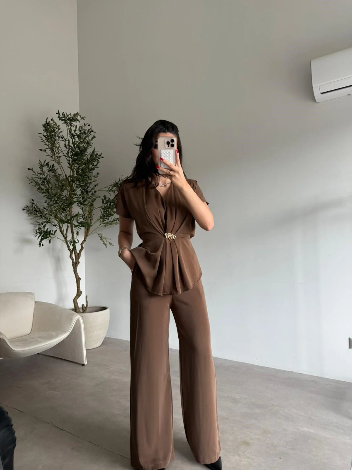Our solid monotone set featuring a Monotone blouse with gold button detailing with wrap around strings along with wide legged pants is for sure a show stopper. Summersets are all year round clock best sellers. From a day occasion, tonight's get-together, the button detailing pattern, just add a touch to the overall look's aesthetics.