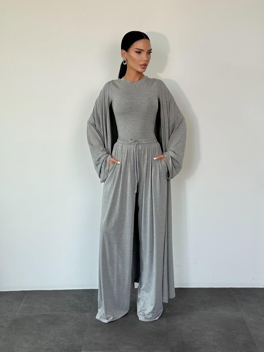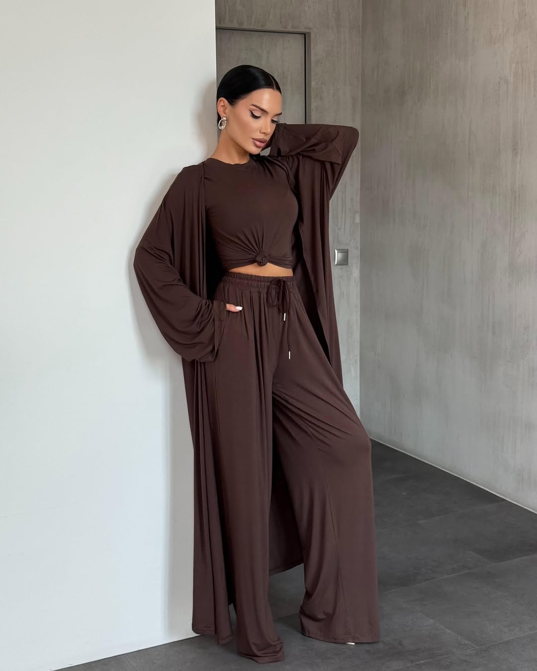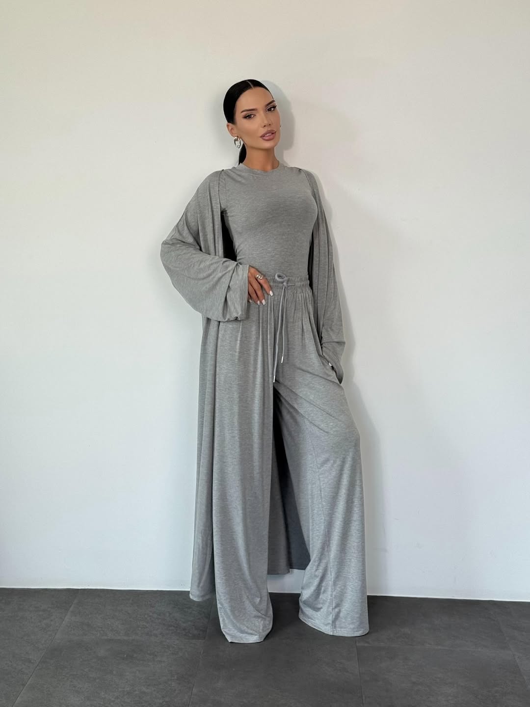 Our solid track set featuring wide-legged pants , Round neck Tee along with Coordinated shrug is for sure a show stopper. Tracksuits are all-year round-the-clock best sellers. The flowy pattern adds a touch to the aesthetics of the overall look.