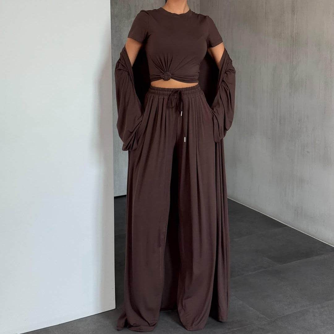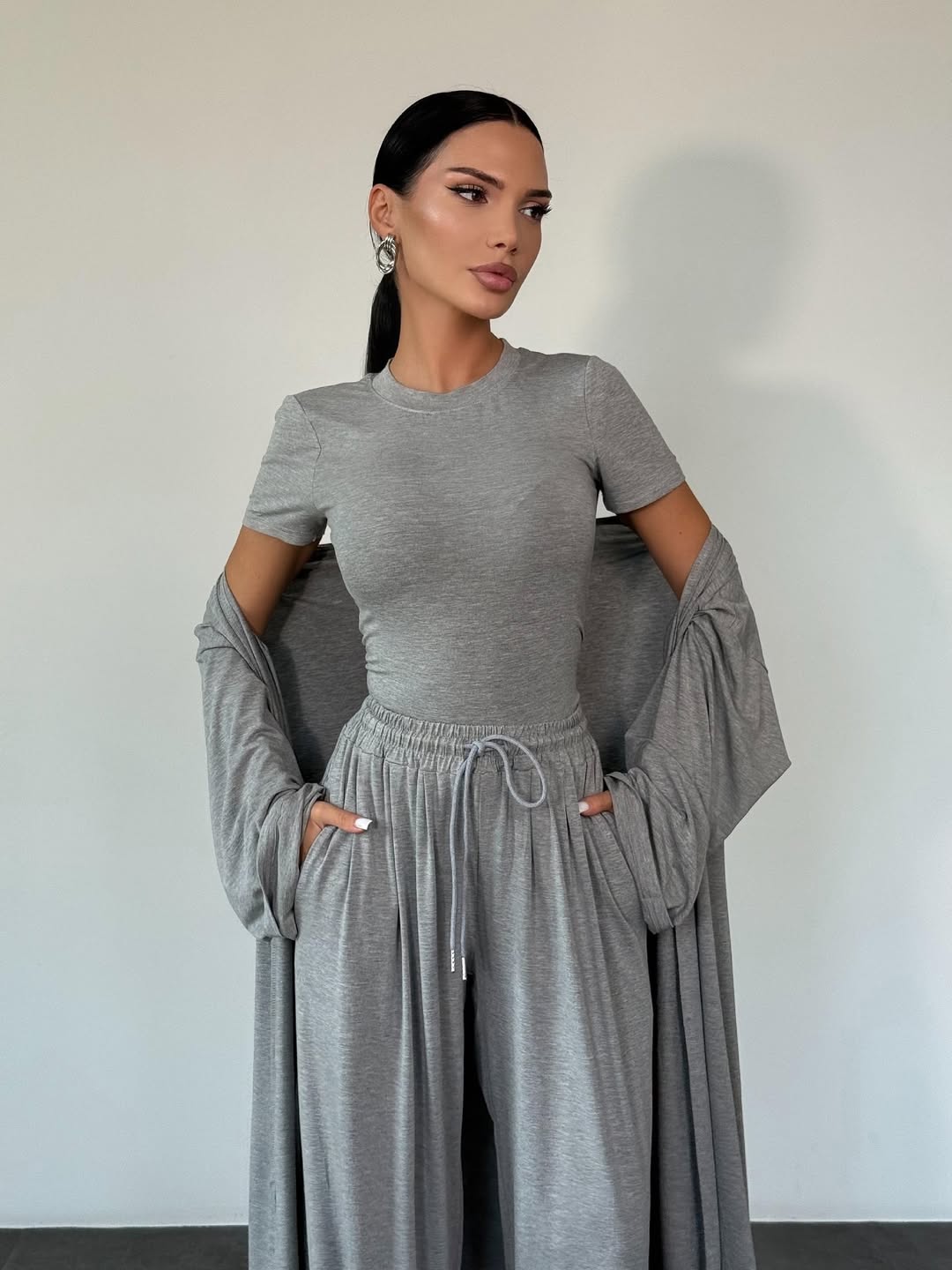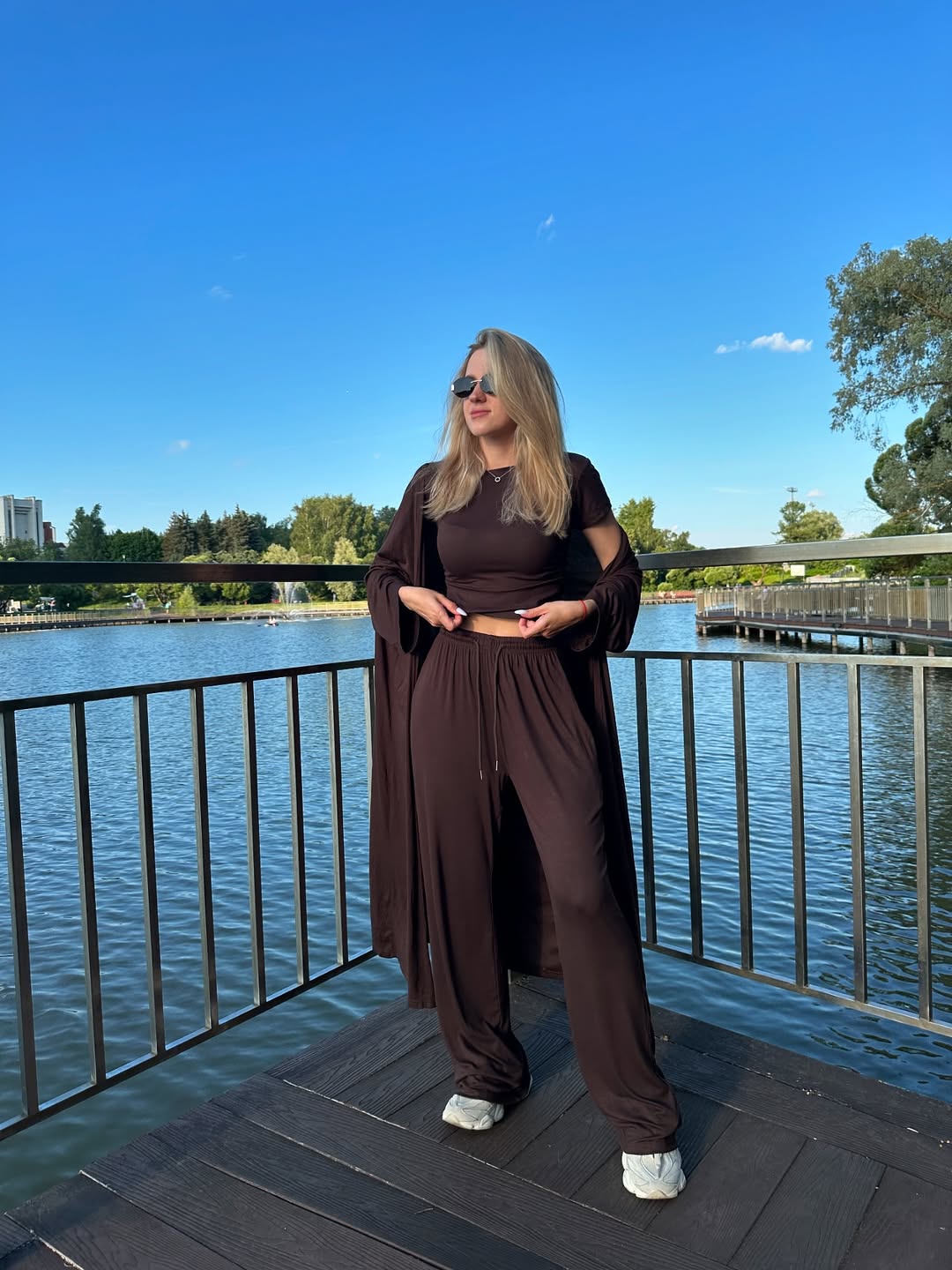Our solid track set featuring wide-legged pants , Round neck Tee along with Coordinated shrug is for sure a show stopper. Tracksuits are all-year round-the-clock best sellers. The flowy pattern adds a touch to the aesthetics of the overall look.