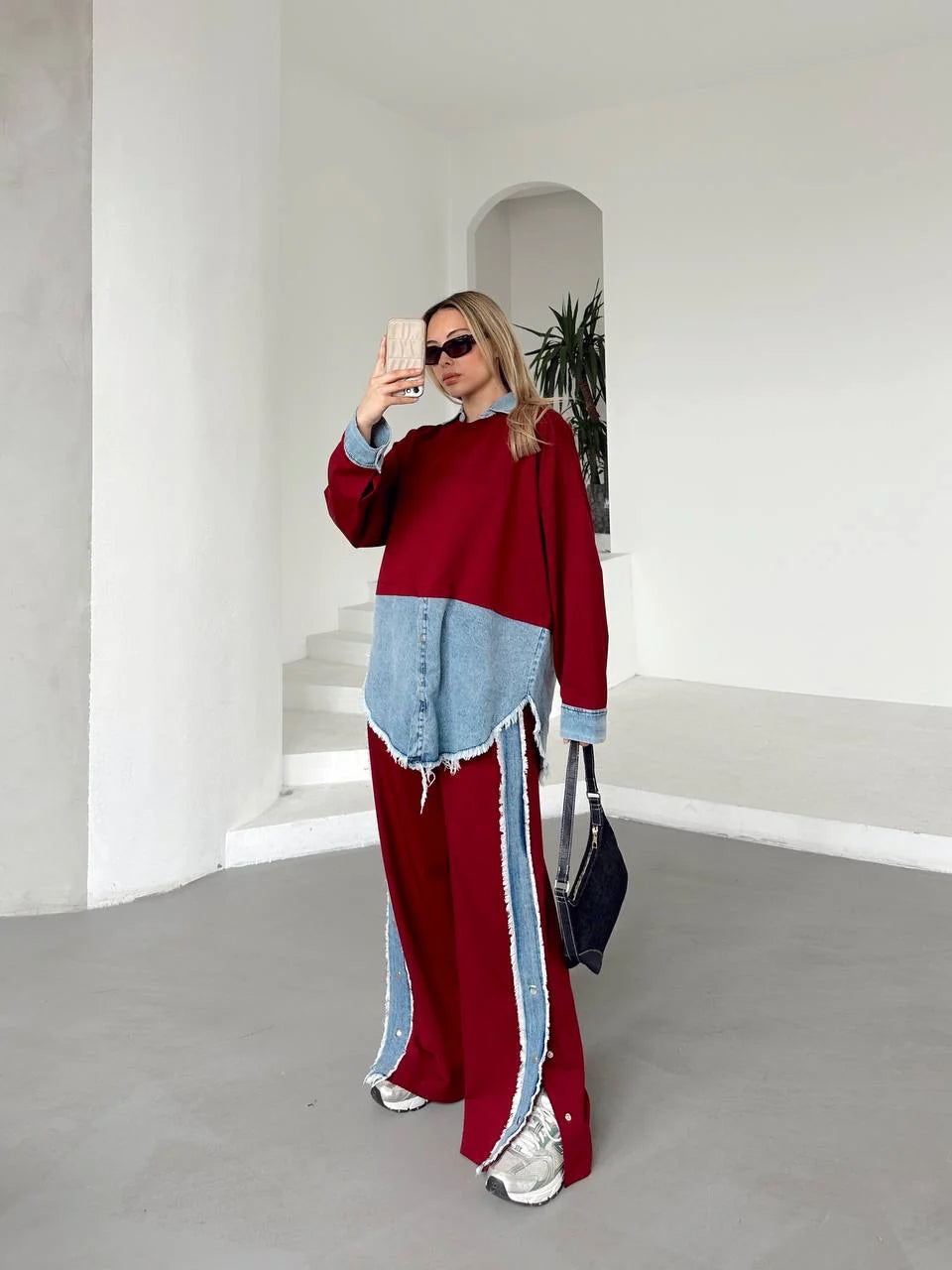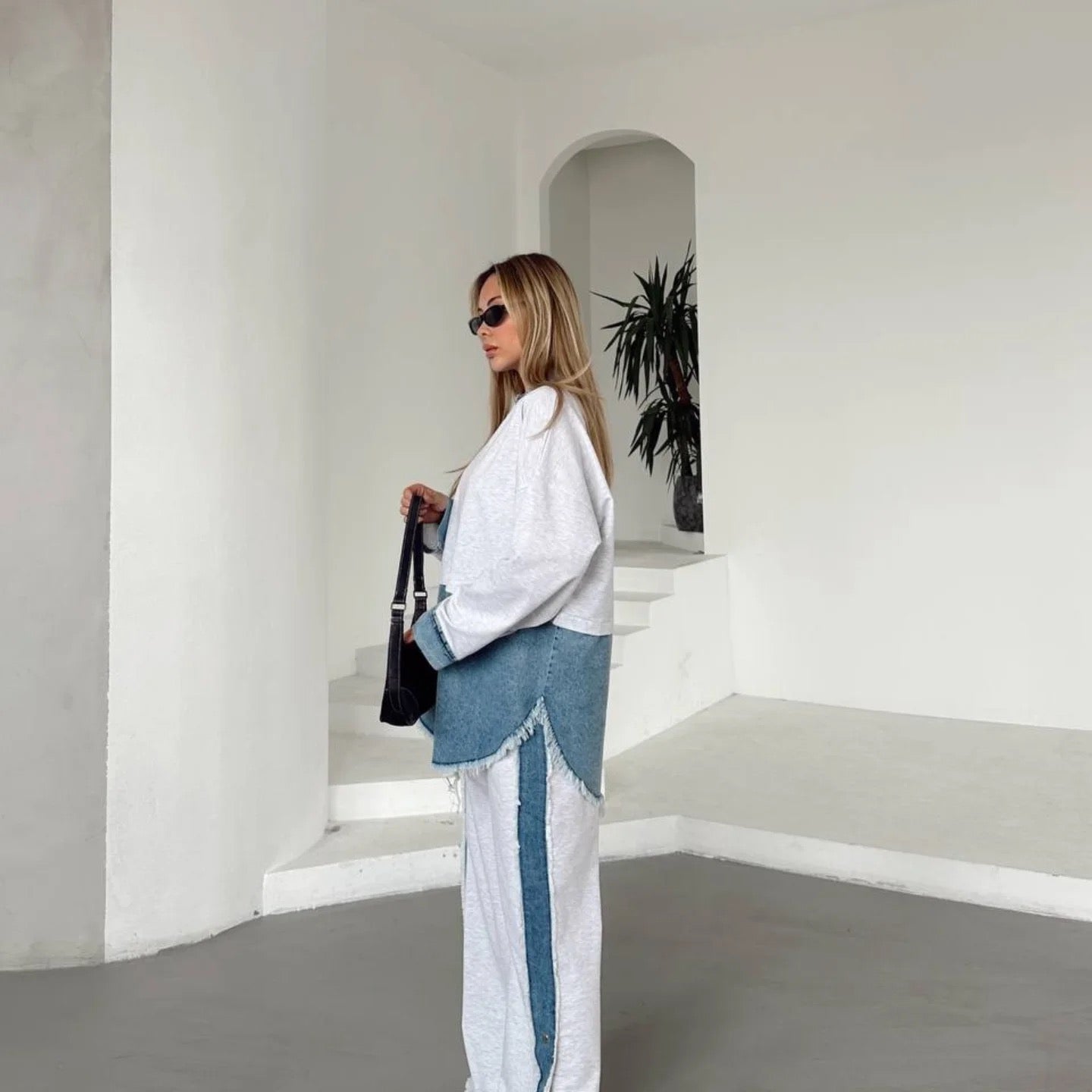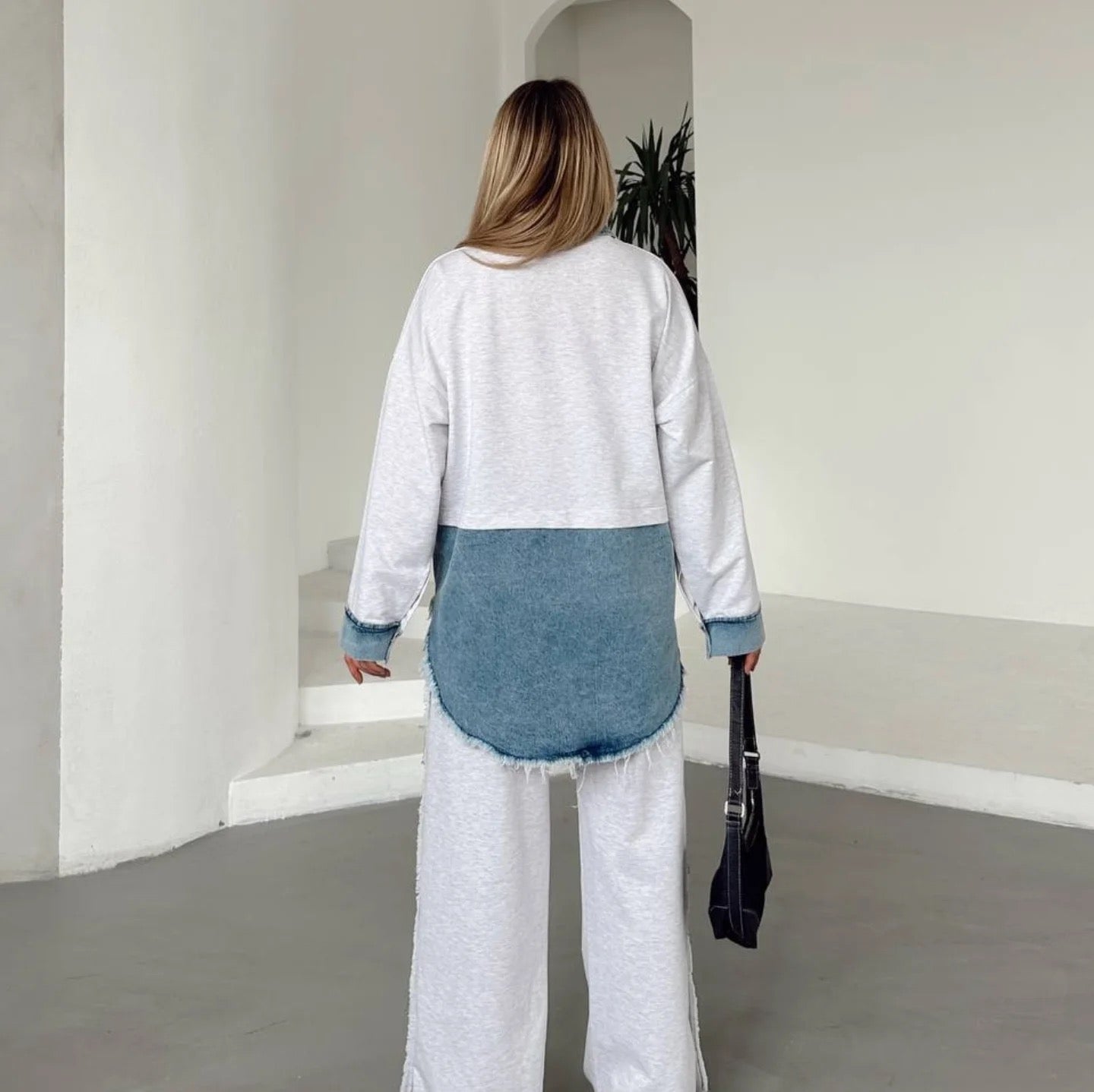 Our coordinated Summer set featuring a coordinated Blouse with denim detailing and a coordinated wide legged denim panel pants is for sure a show-stopper. Summer sets are all year round clock best sellers. From a day occasion, tonight's get-together the minimalistic design detailing makes it a perfect set for all your vacation fits
