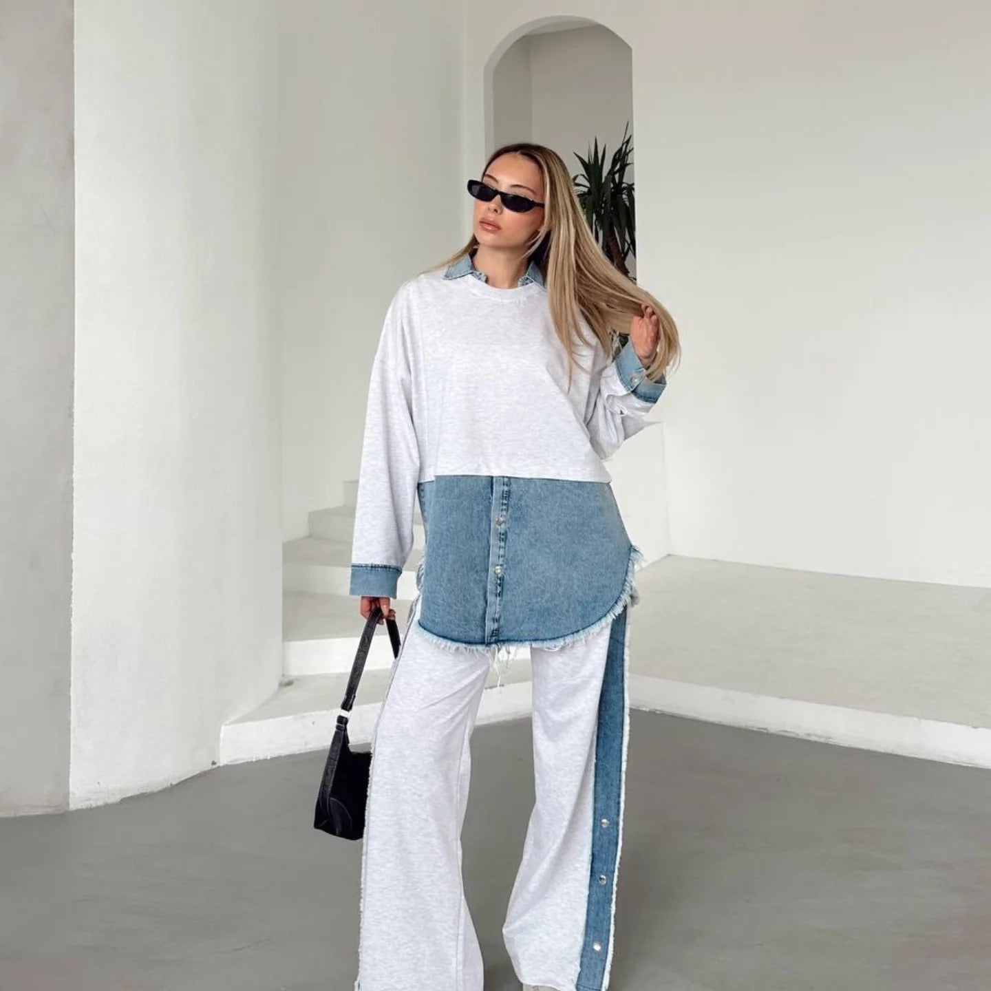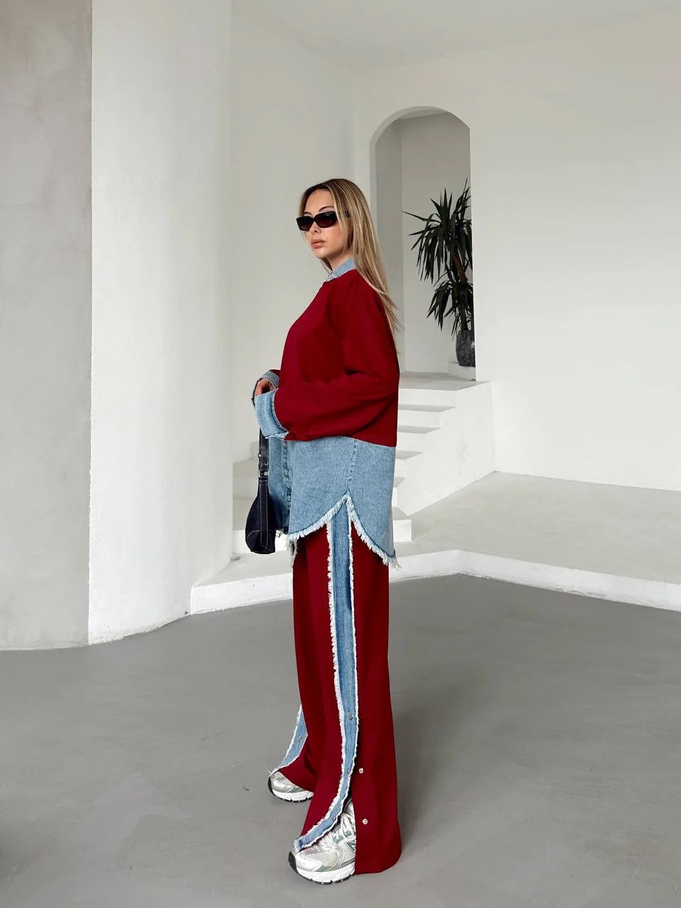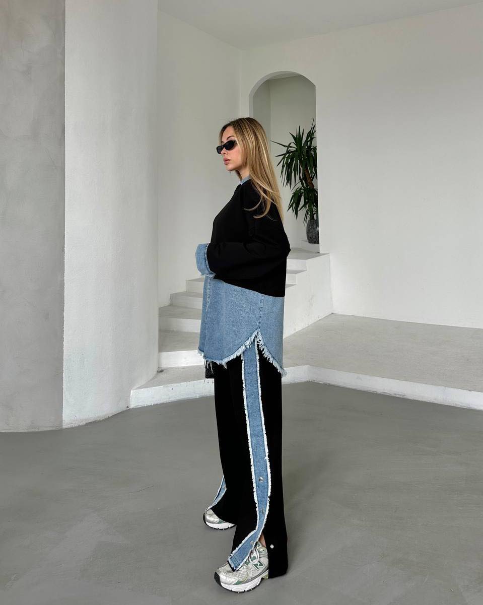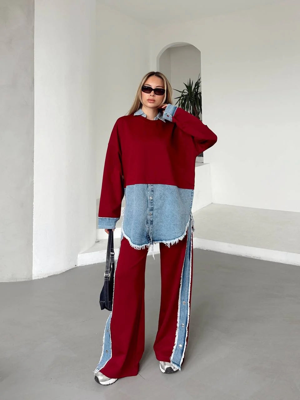 Our coordinated Summer set featuring a coordinated Blouse with denim detailing and a coordinated wide legged denim panel pants is for sure a show-stopper. Summer sets are all year round clock best sellers. From a day occasion, tonight's get-together the minimalistic design detailing makes it a perfect set for all your vacation fits