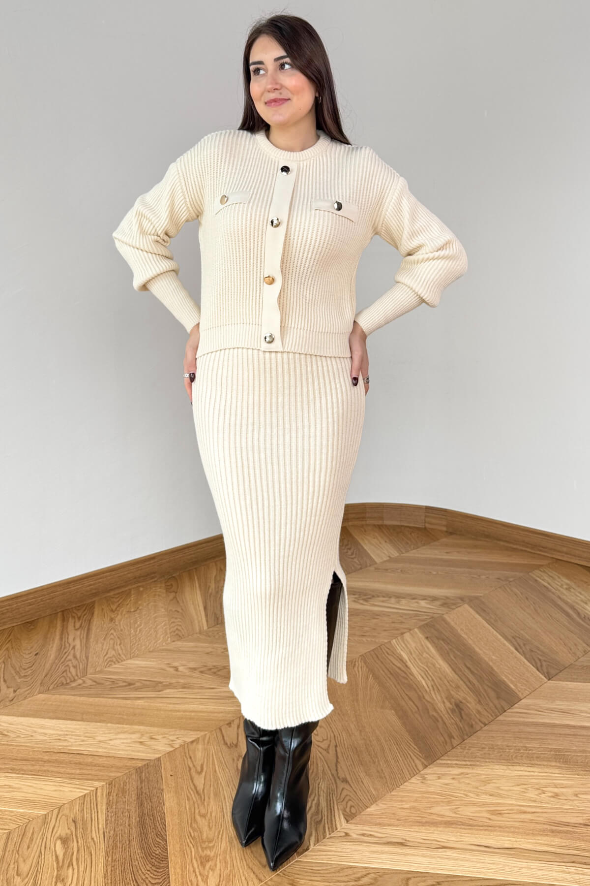 Our monotone coordinated set in the imported knitted fabric featuring a round-neck, coordinated Cardigan with button detailing and Knitted Skirt is for sure a show stopper. Coordinated Sets are Must have Winter Essential . From an outdoor get-together to a comfortable look, these dresses are the perfect fit. The fusion of an elegant pattern and detailing just adds a touch to the aesthetics of the overall look.