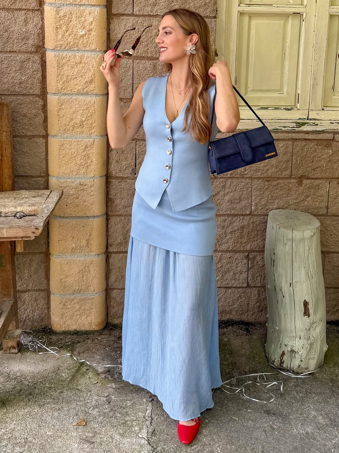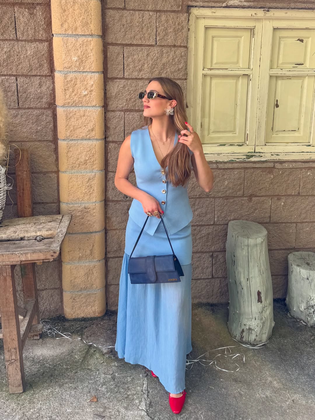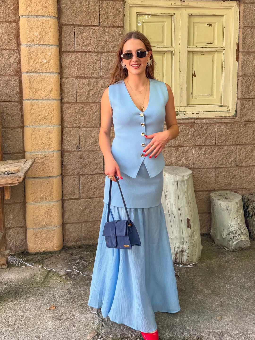 Our coordinated Summer set  featuring a coordinated Blouse with button detailing and a coordinated gored skirt is for sure a show-stopper. Summer sets are all year round clock best sellers. From a day occasion, tonight's get-together the minimalistic design detailing makes it a perfect set for all your vacation fits