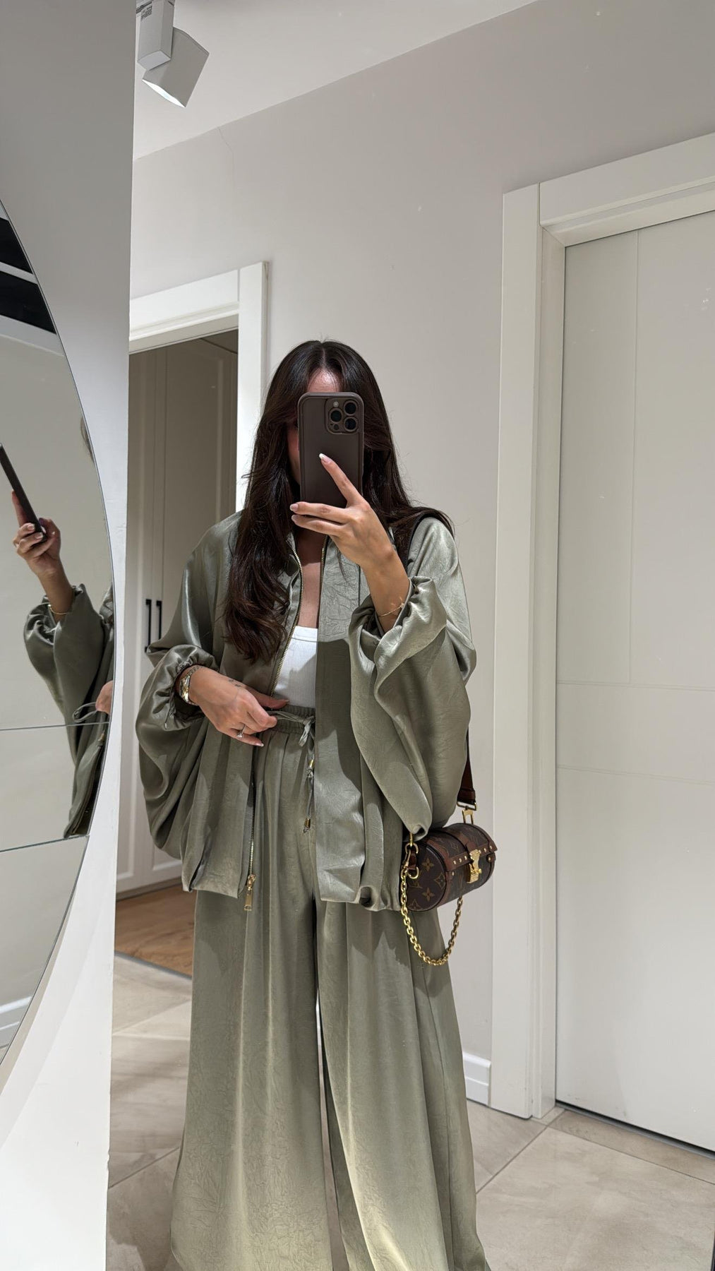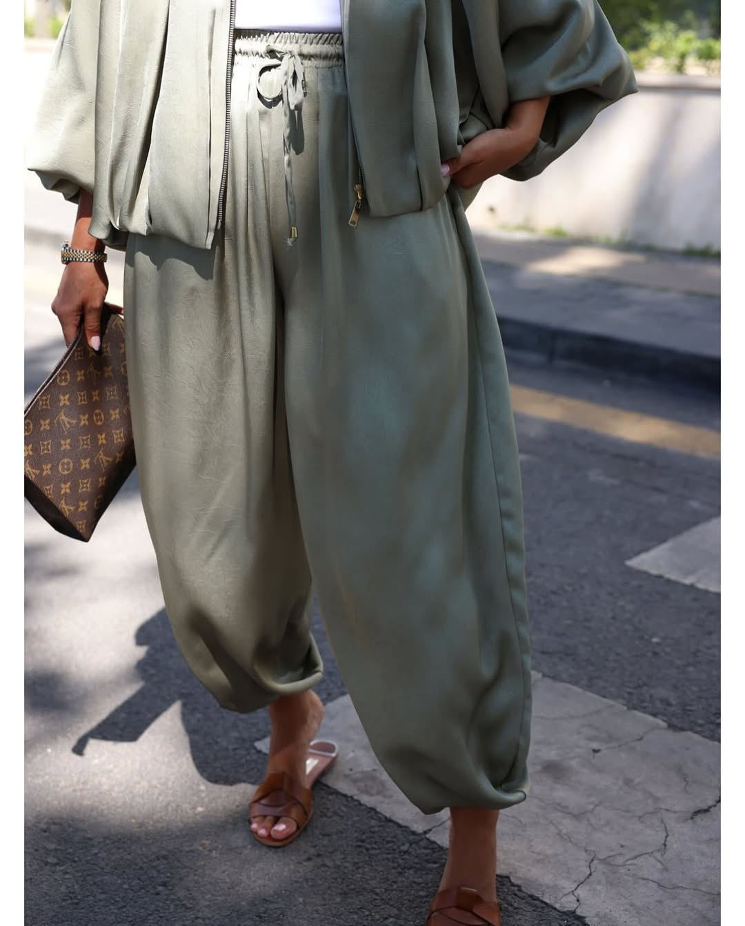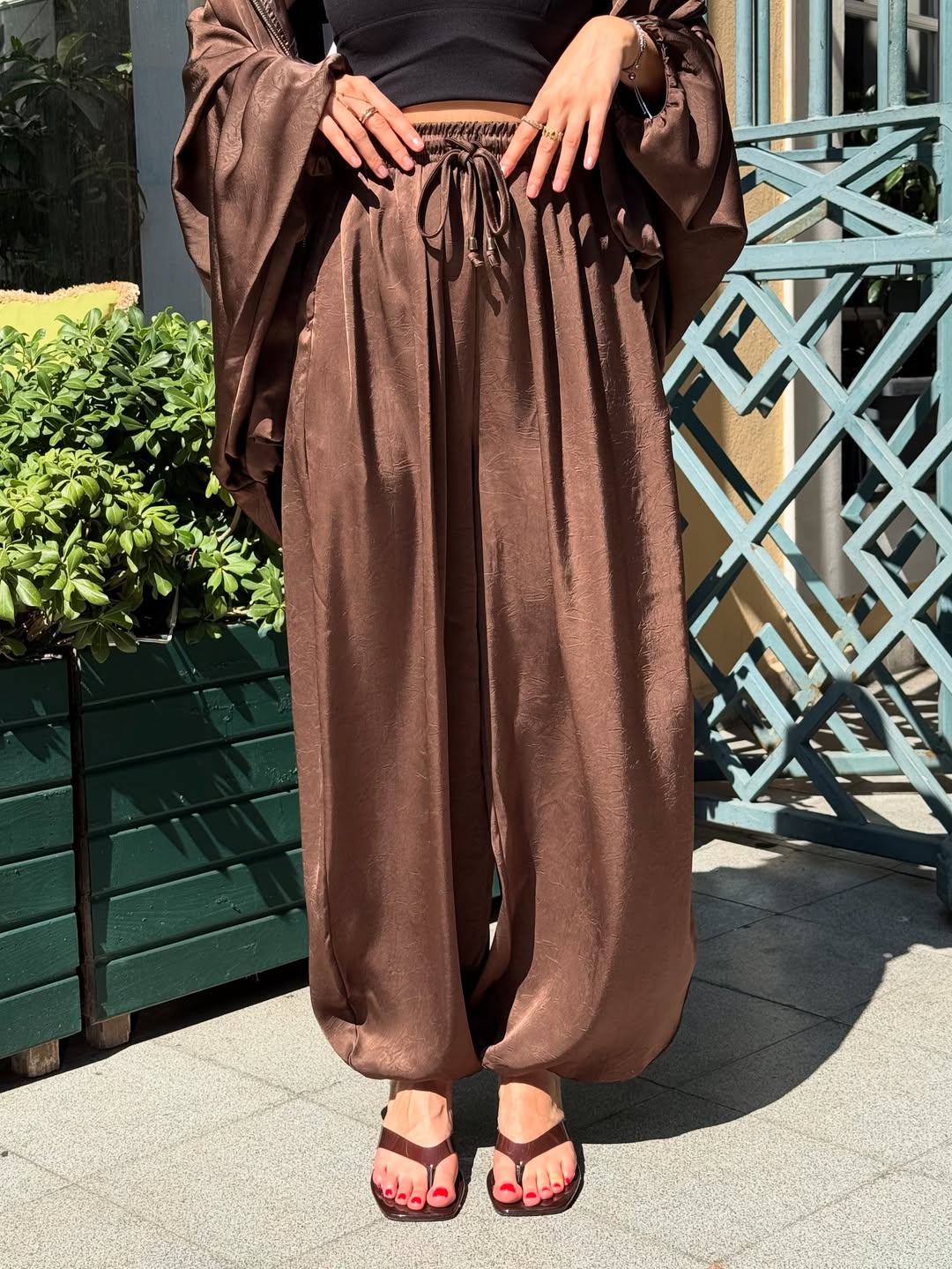 Features: Stretchable, elastic wrist,,wide-legged pants, satin bomber jacket