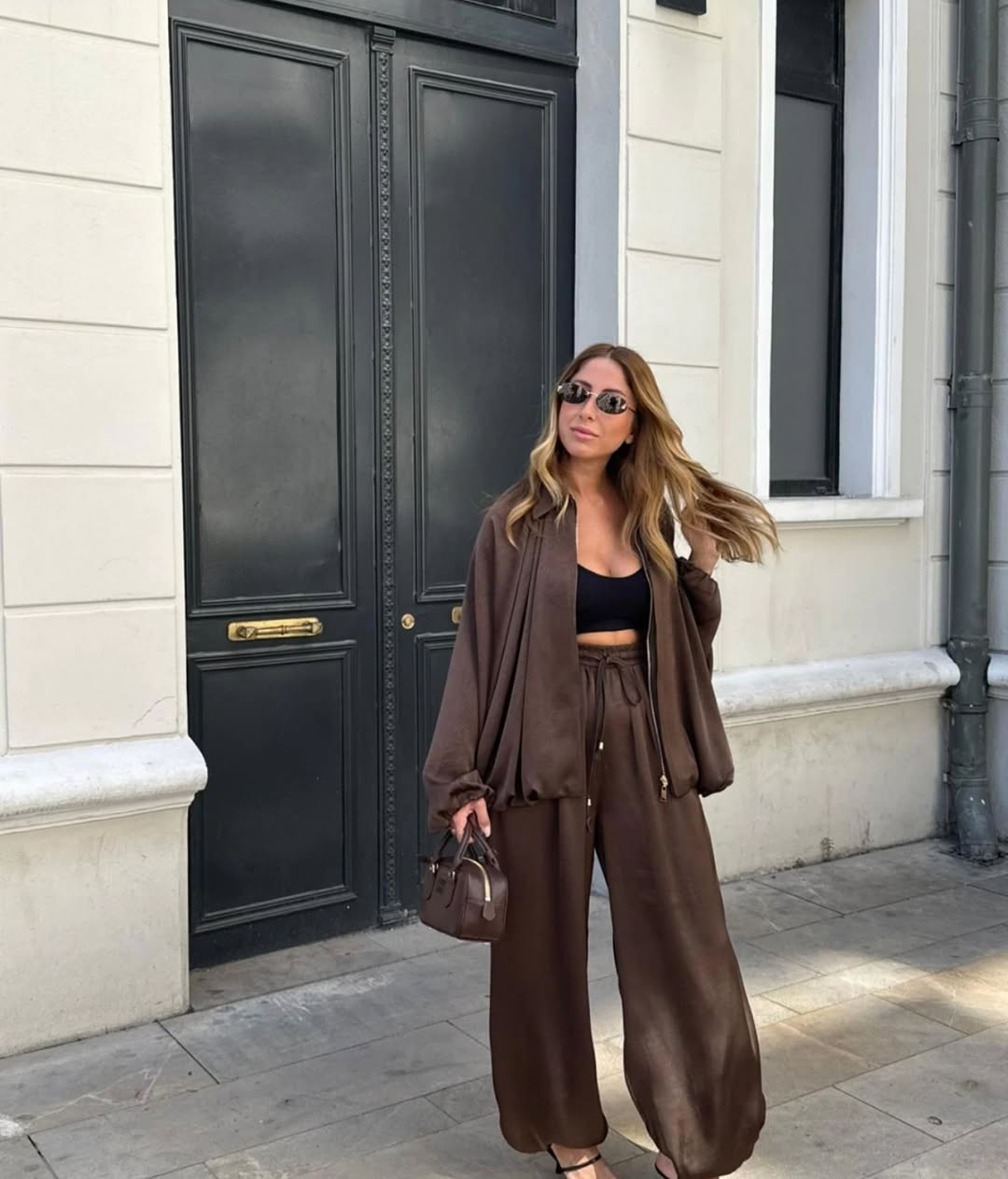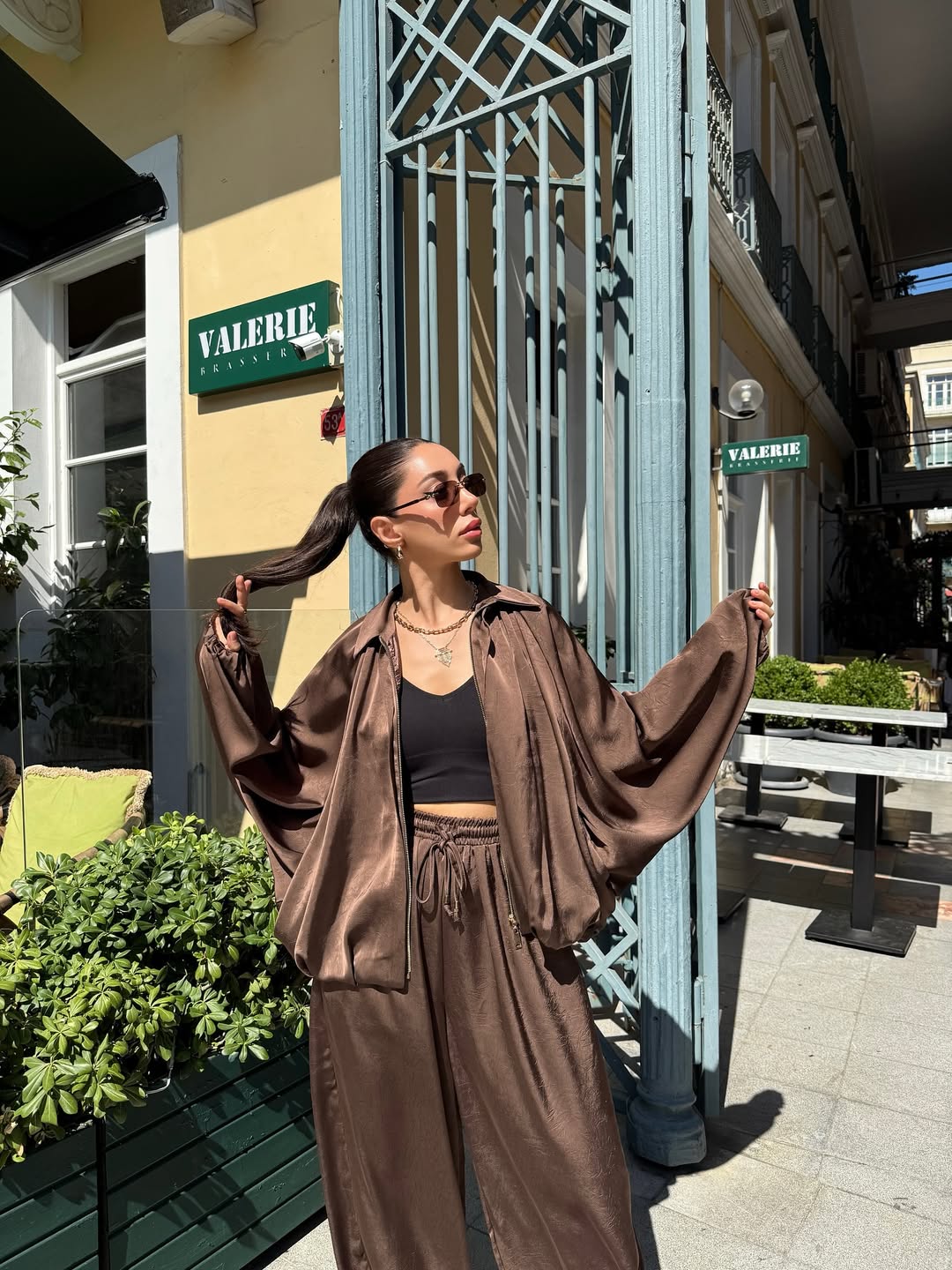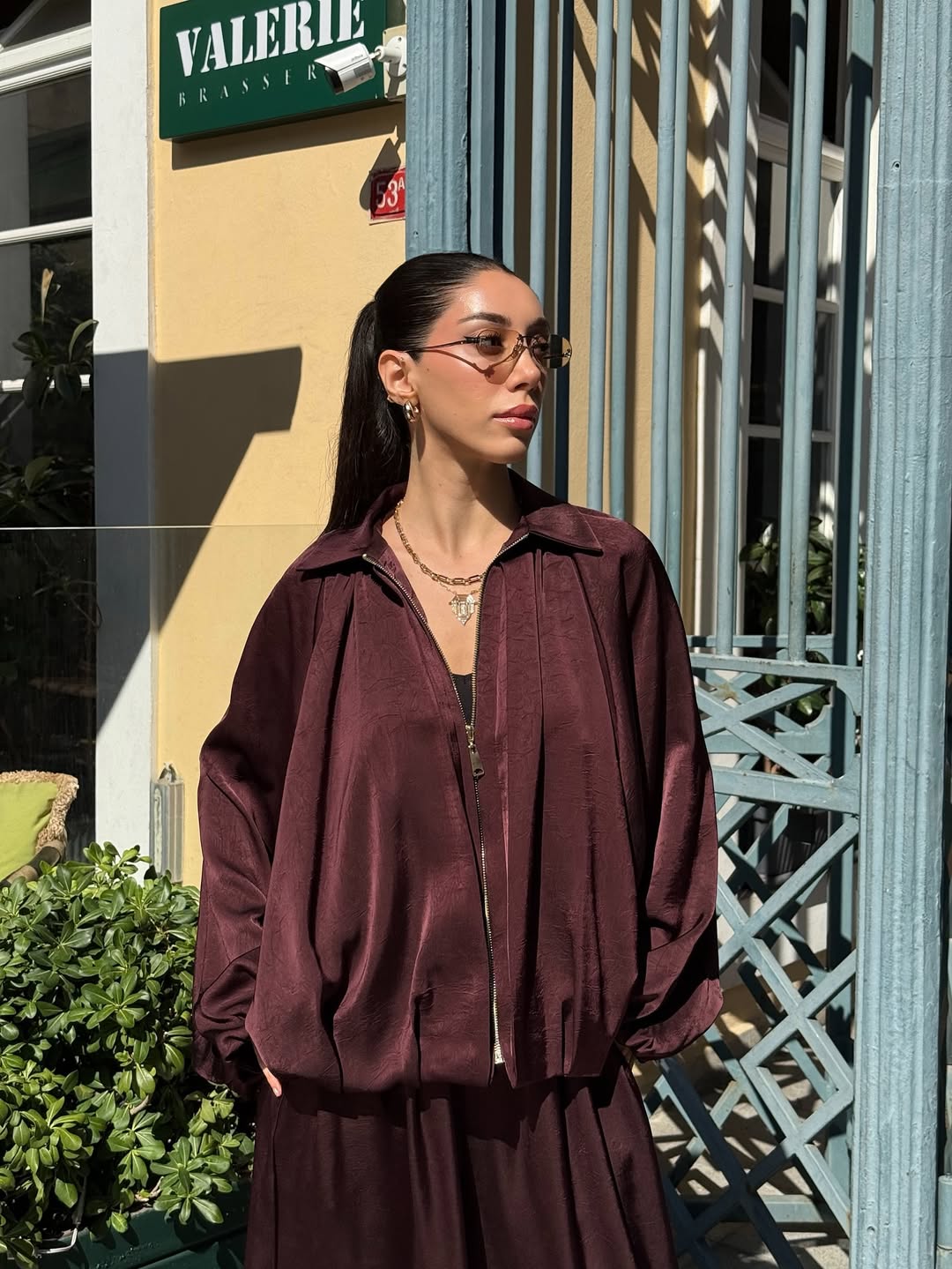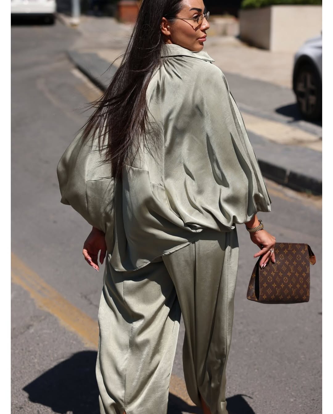 Our solid Luxury Satin set containing wide-legged pants with rhinestone detailing and Satin Bomber jacket featuring batwing Sleeves and elastic wrist is for sure a show stopper. Tracksuits are all-year round-the-clock best sellers. The golden zipper pattern adds a touch to the aesthetics of the overall look.