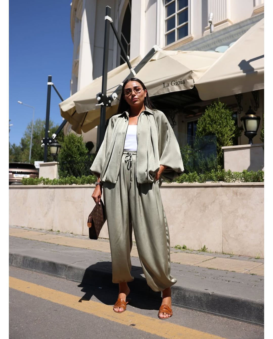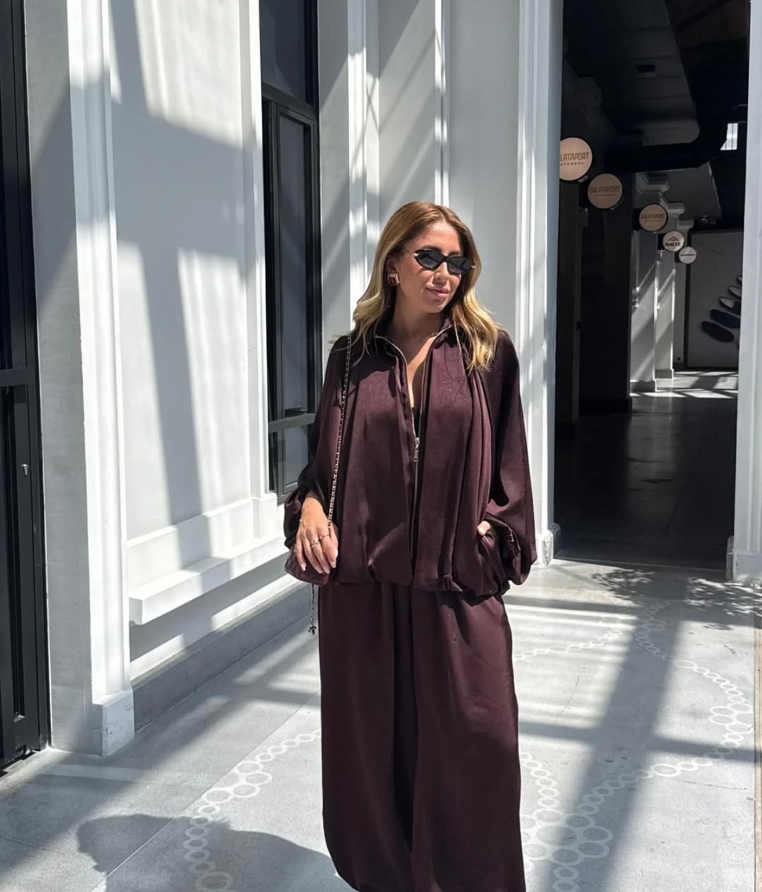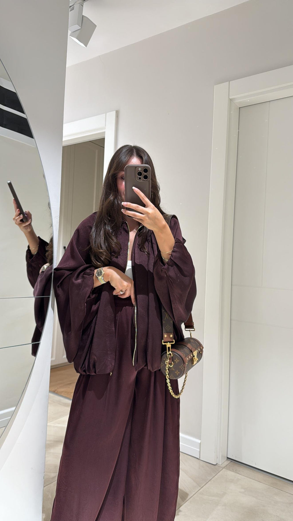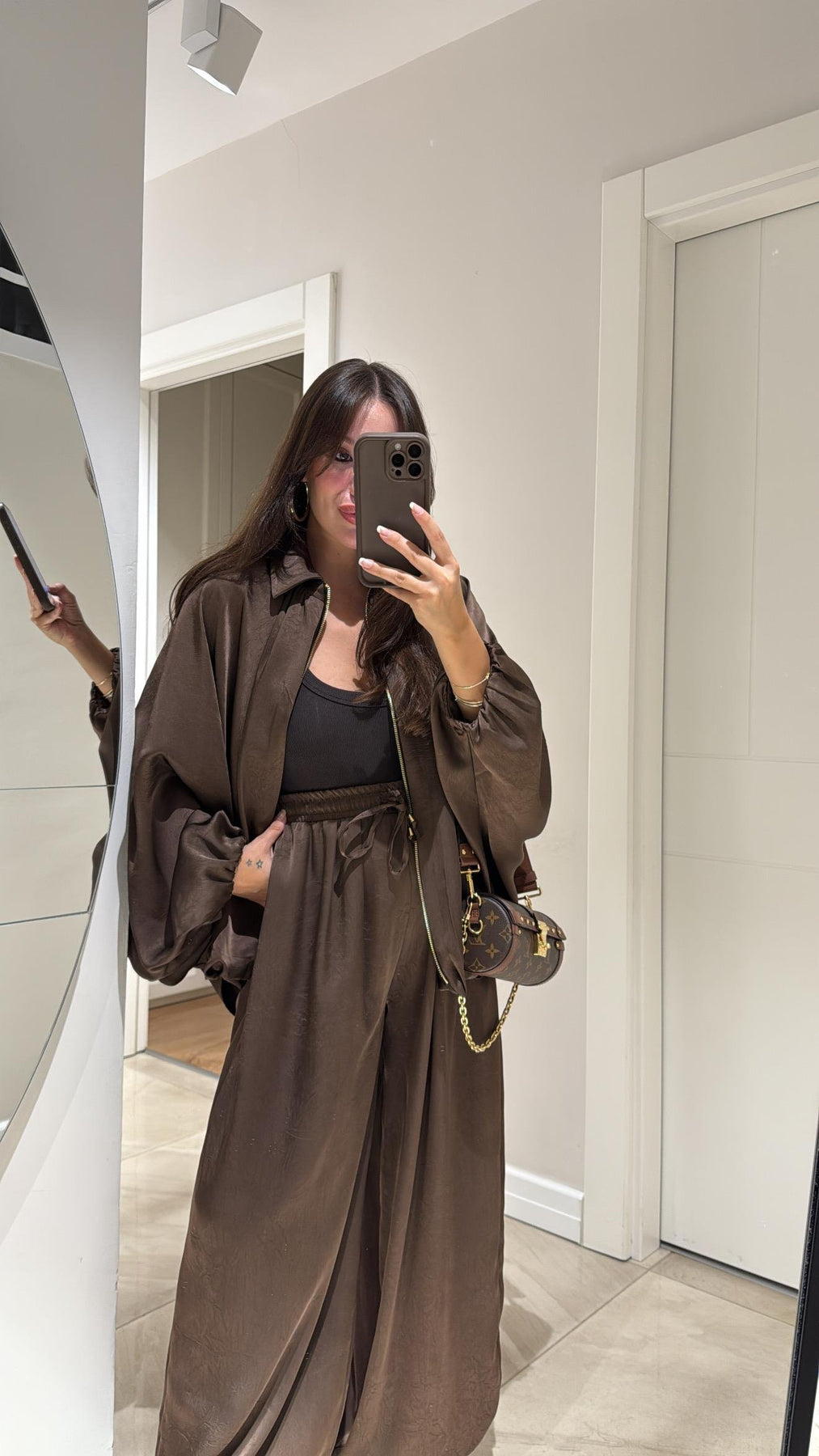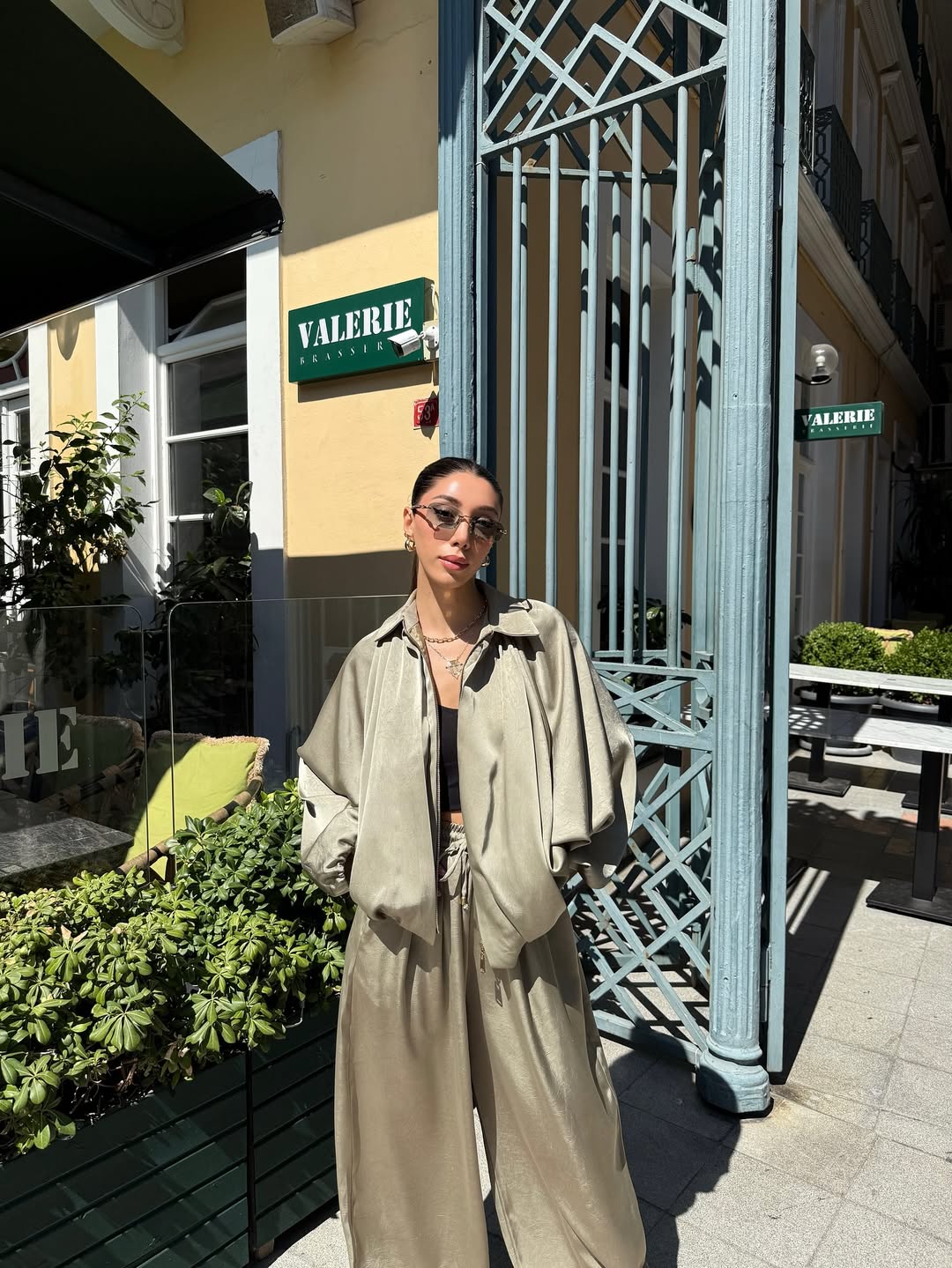 Our solid Luxury Satin set containing wide-legged pants with rhinestone detailing and Satin Bomber jacket featuring batwing Sleeves and elastic wrist is for sure a show stopper. Tracksuits are all-year round-the-clock best sellers. The golden zipper pattern adds a touch to the aesthetics of the overall look.