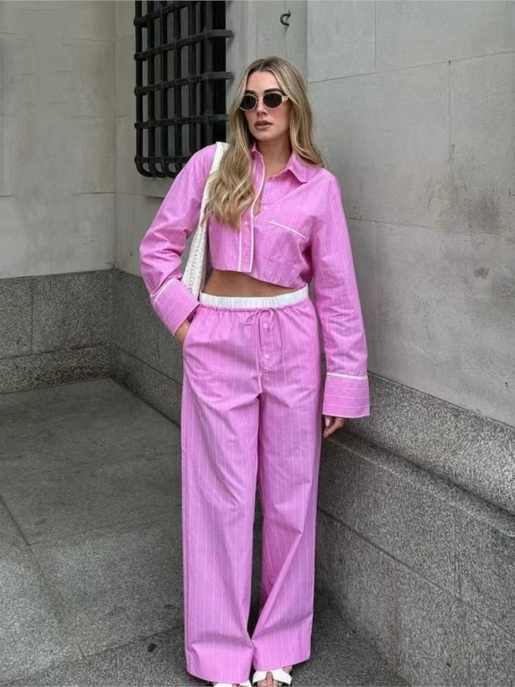 Our Coordinated Set in summer-friendly color featuring striped pants with coordinated blouse is for sure a show-stopper. COORD SETS are all year-round clock best sellers. From a day occasion, tonight's get-together, the modern style, and striped pattern detailing, crop top, and coordinating pants just add a touch to the overall look's aesthetics.