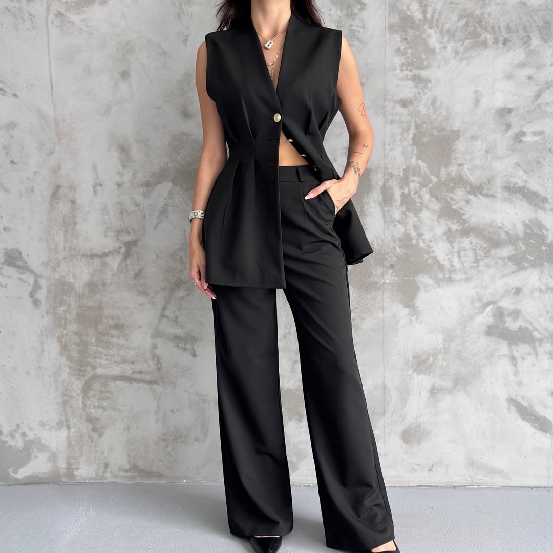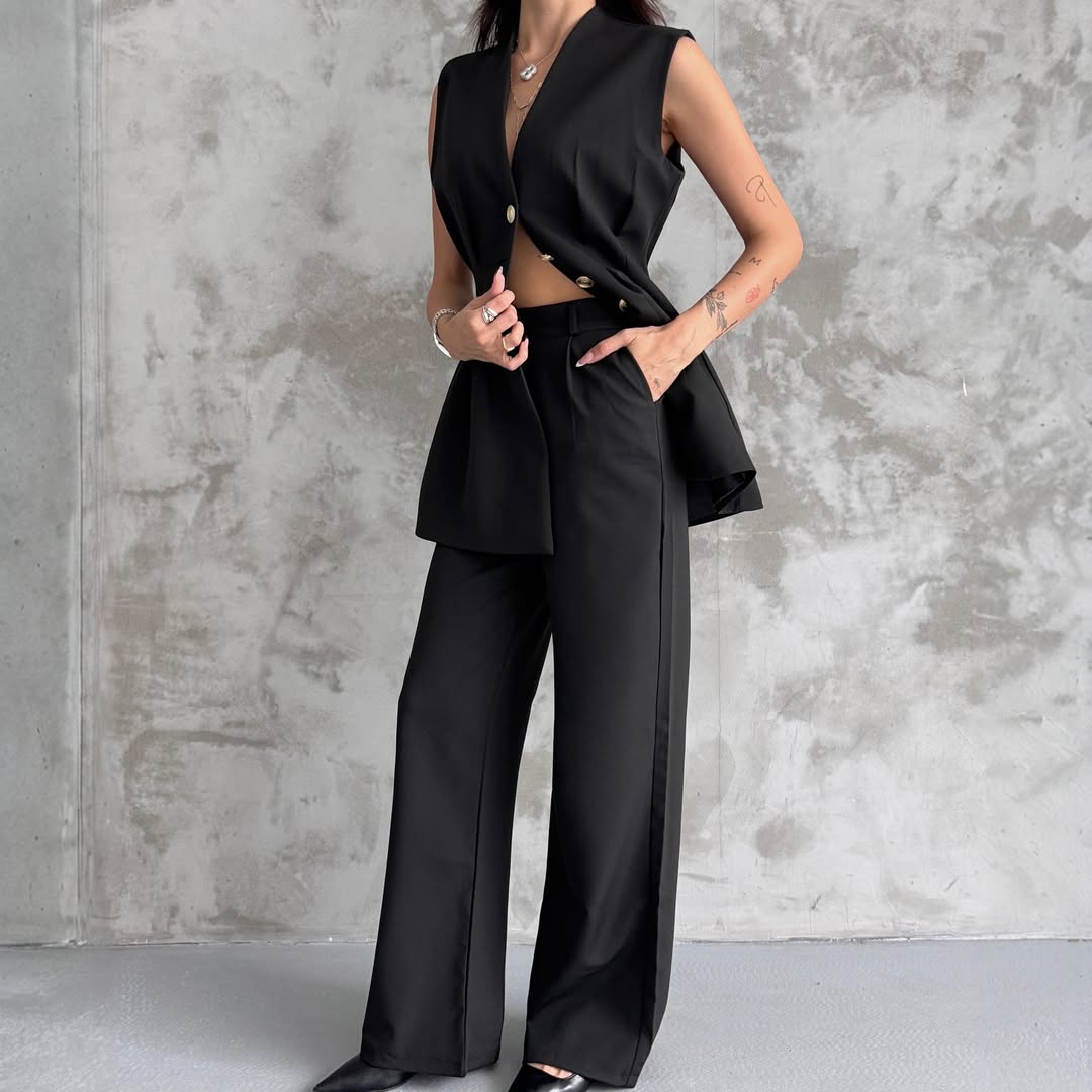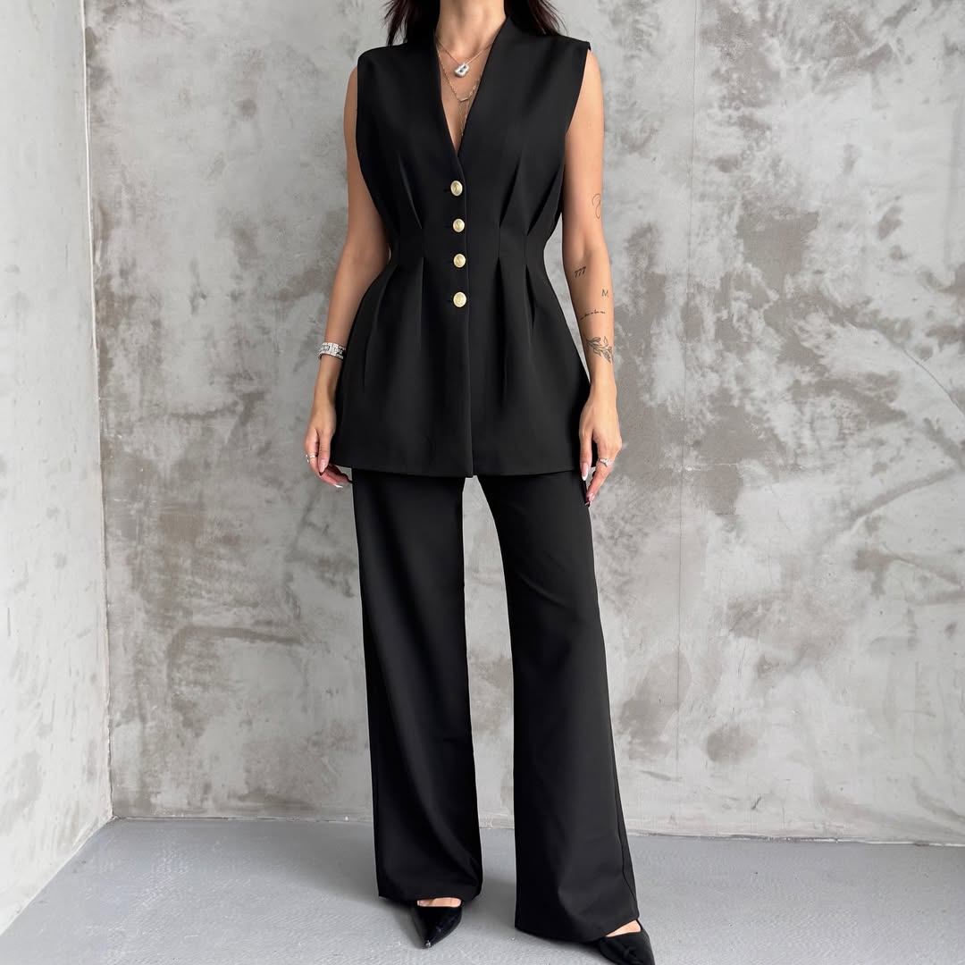 Features: coordinating short sleeveless vest and a coordinated pants