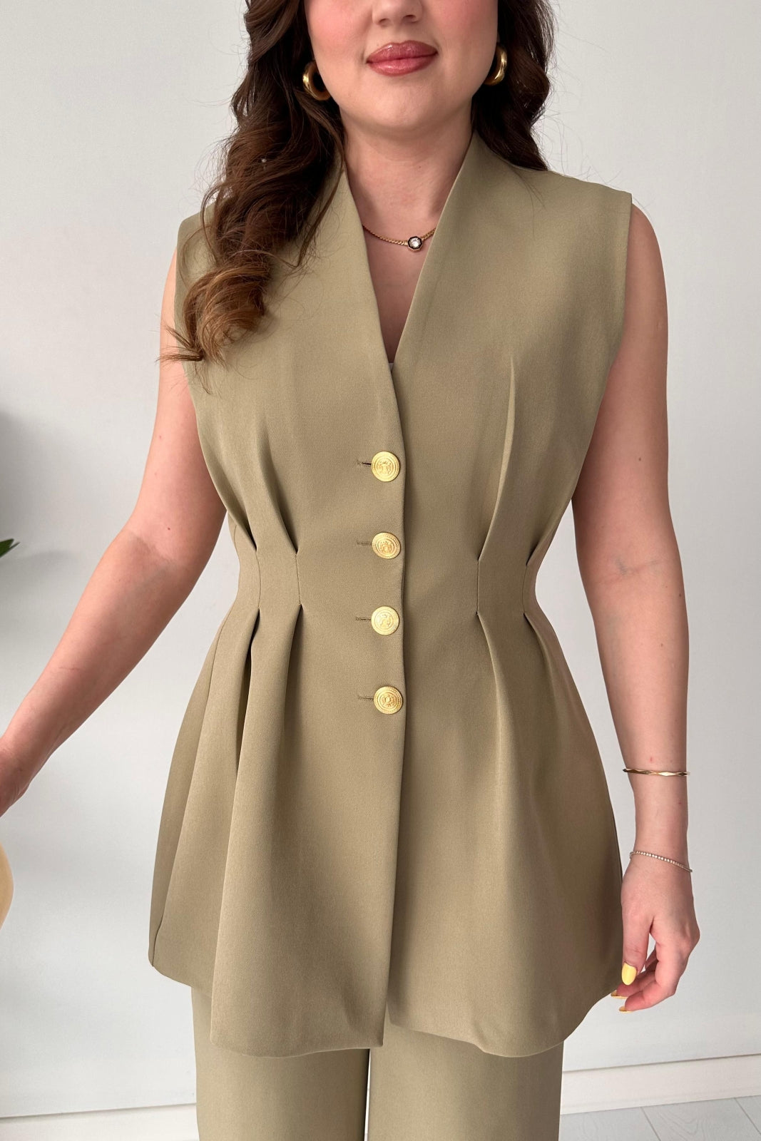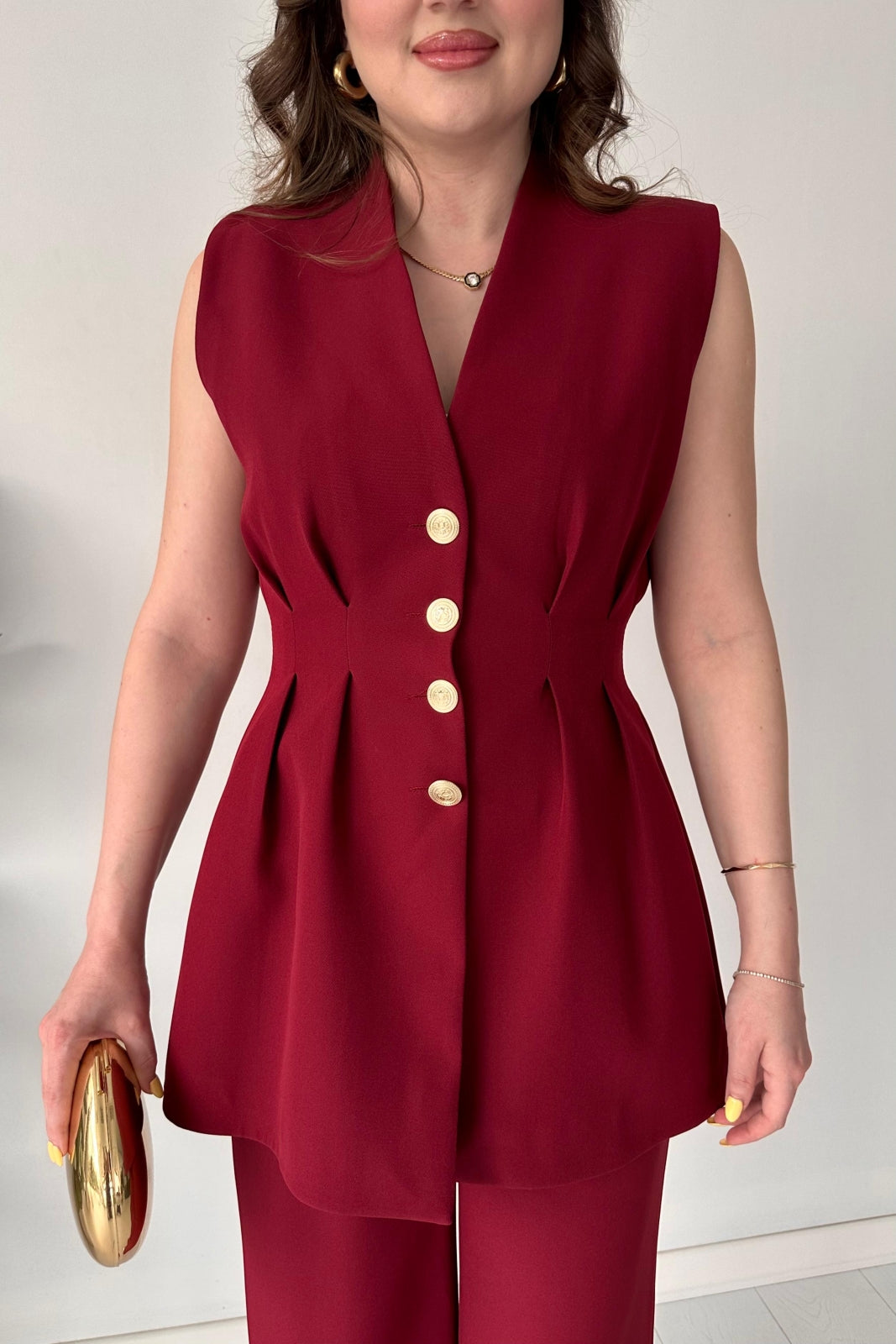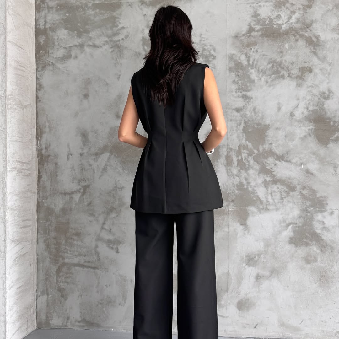 Features: coordinating short sleeveless vest and a coordinated pants