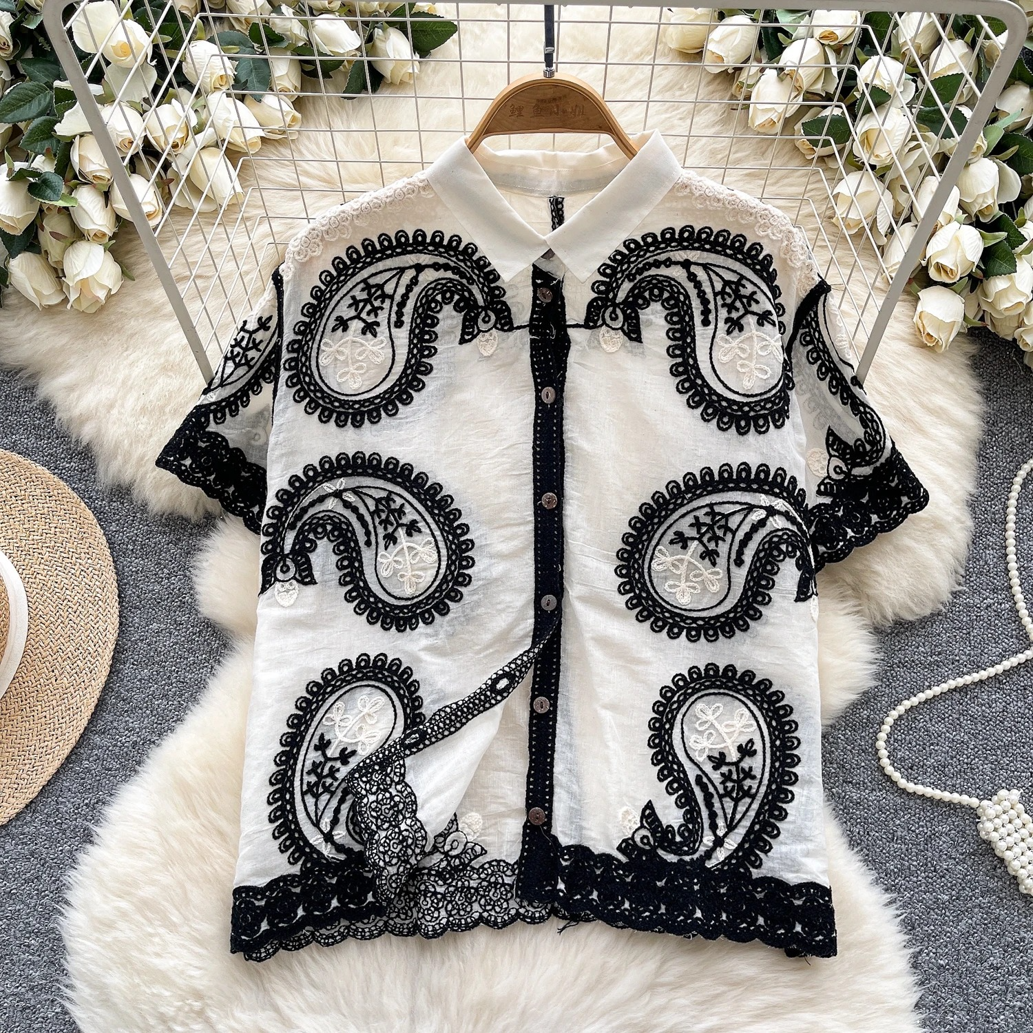 features: embroidered blouse with wide legged pants;denim collar