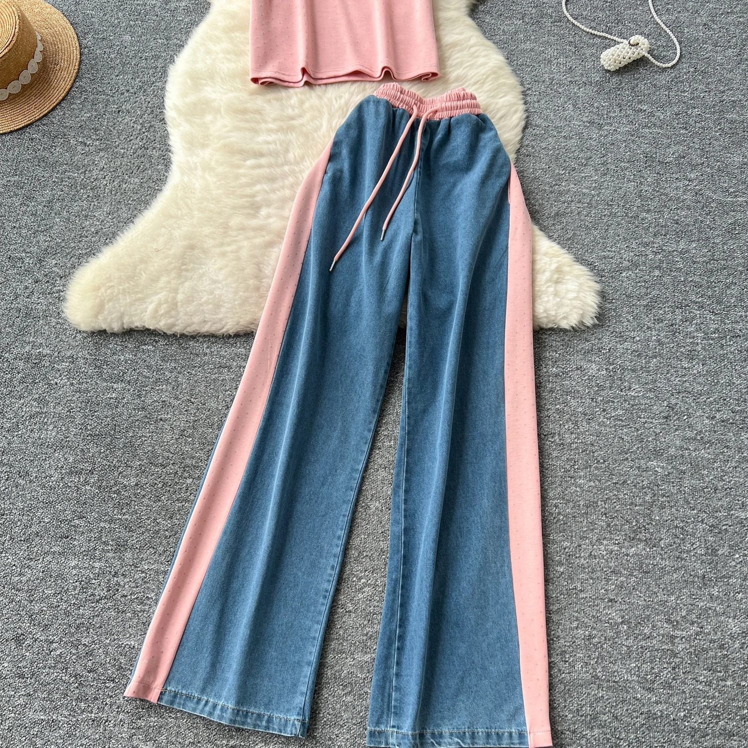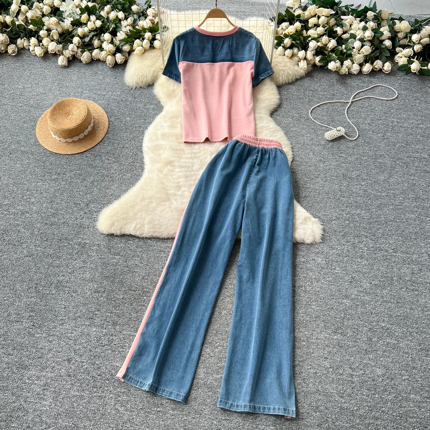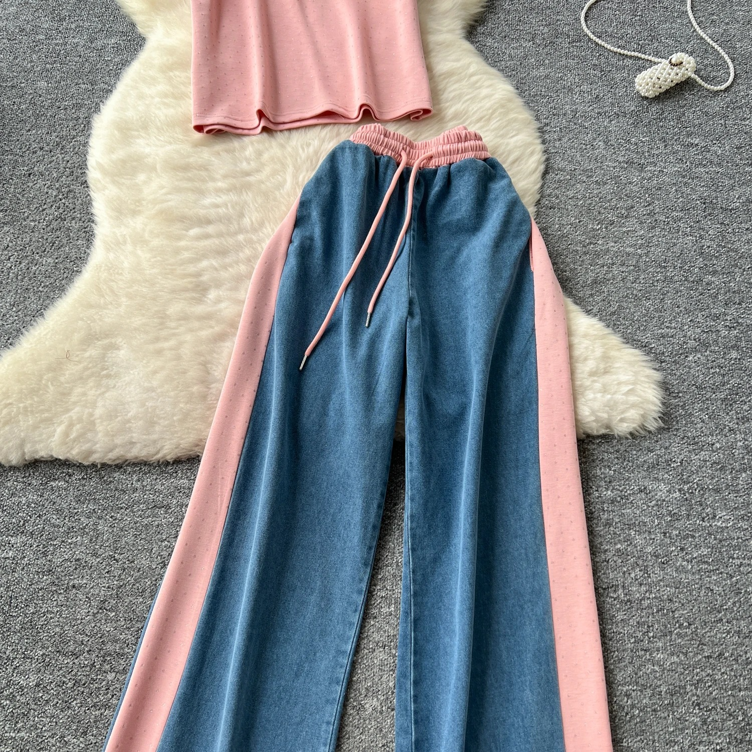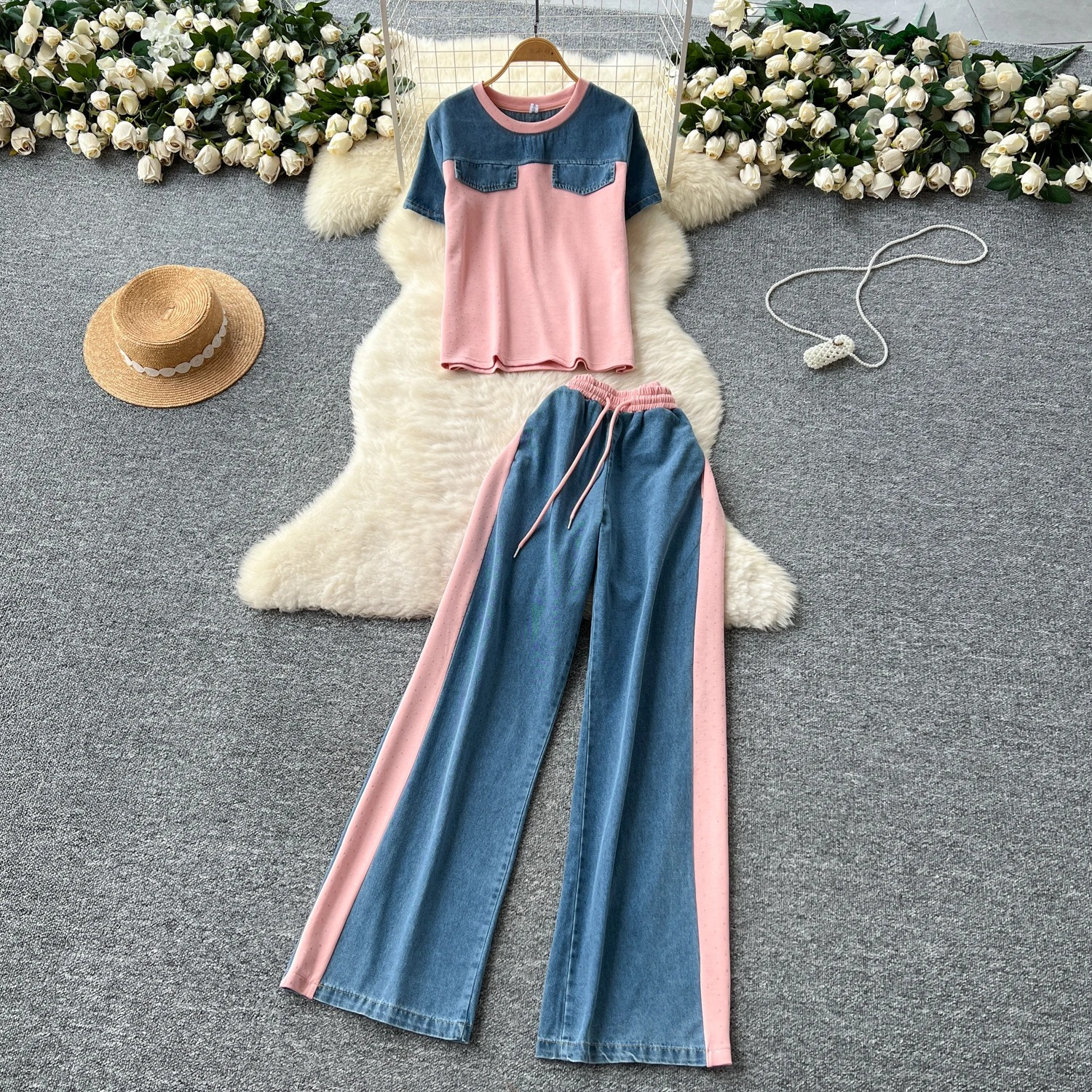 Our coordinated Summer set featuring a coordinated Blouse with denim detailing and a coordinated wide legged denim panel pants is for sure a show-stopper. Summer sets are all year round clock best sellers. From a day occasion, tonight's get-together the minimalistic design detailing makes it a perfect set for all your vacation fits