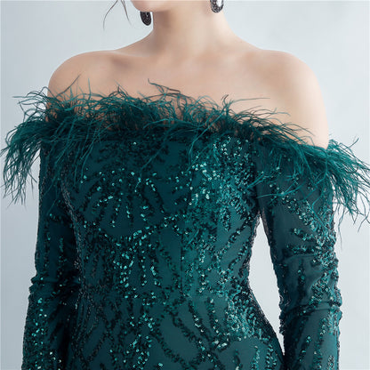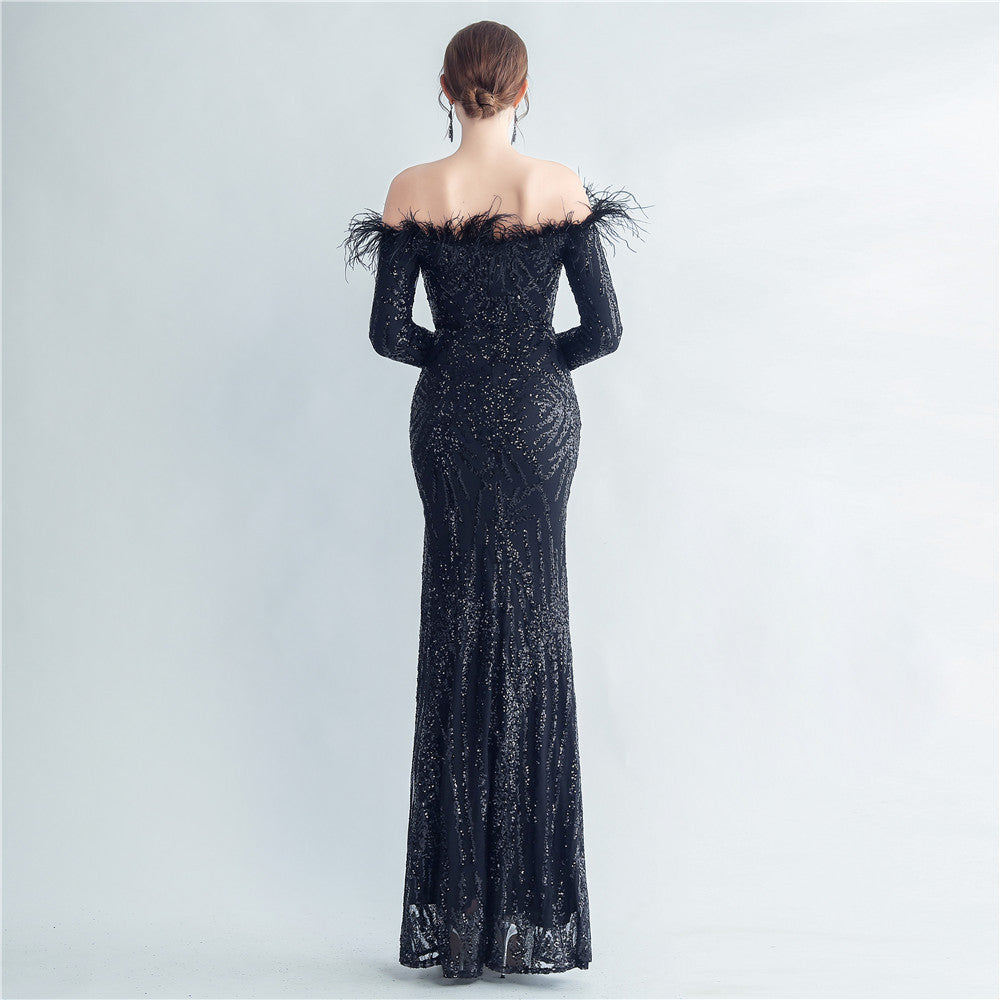 Our flaring Maxi Dress featuring on and off sleeves with feather detailing,featuring sequin work and a long slit and is a must-have gown for your wardrobe. Flaring Dresses are all year round clock best sellers. From a day occasion, tonight's get-together, Flaring dresses just add a touch to the overall look's aesthetics.