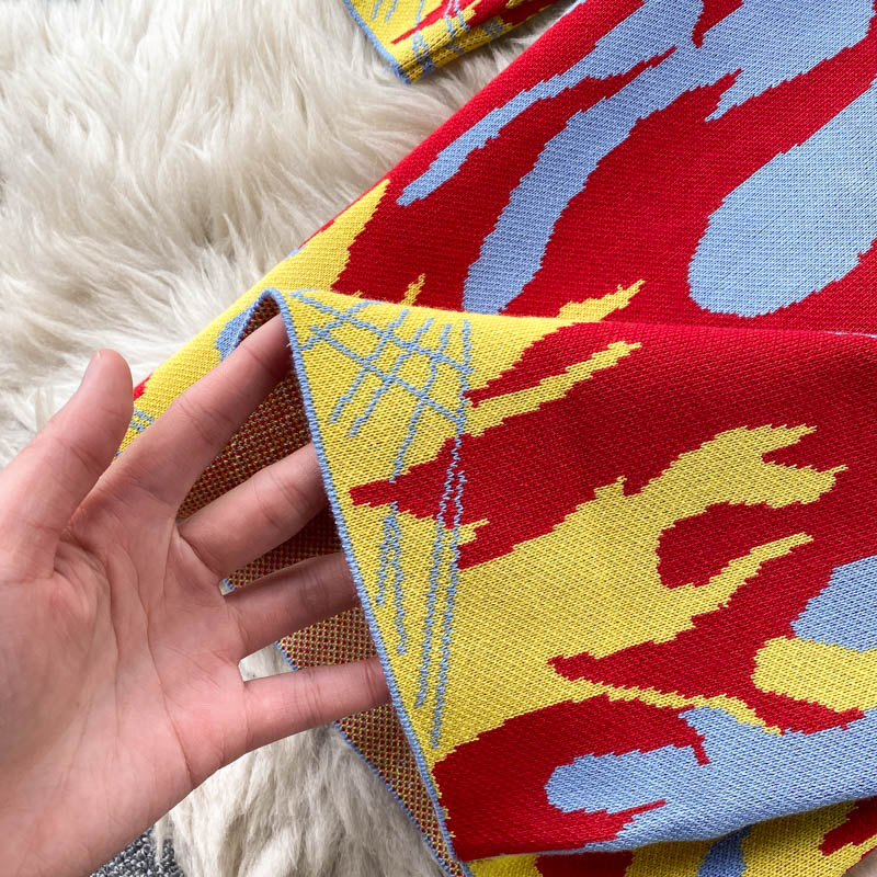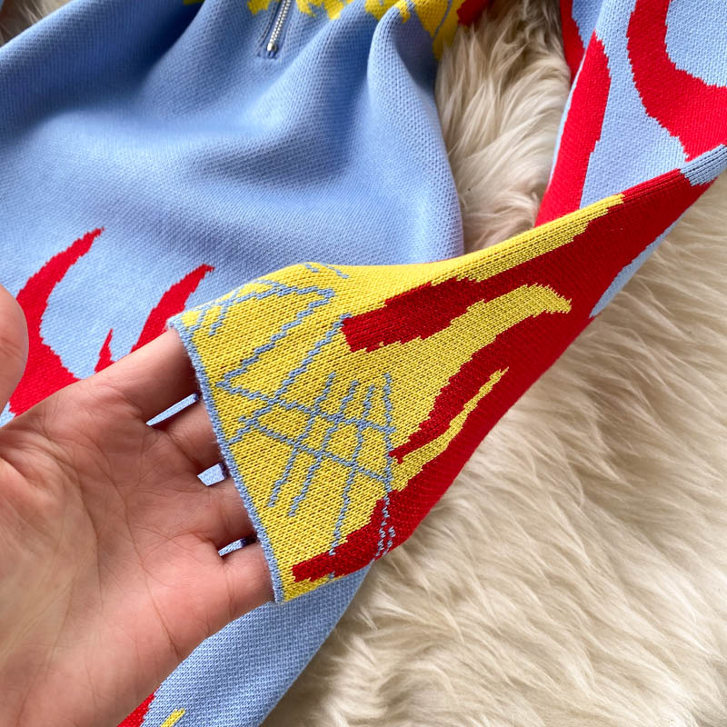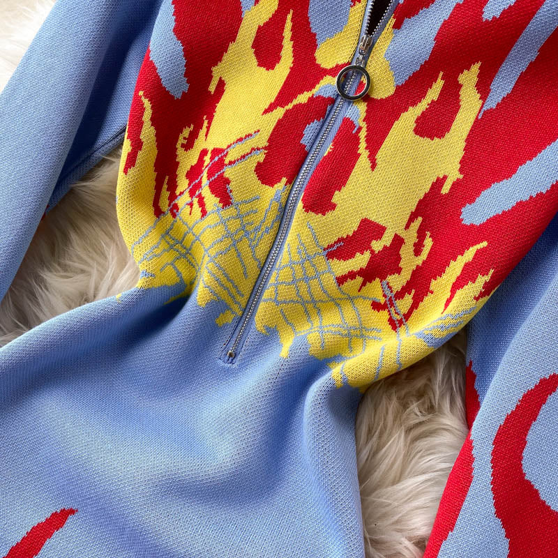 Our Bodycon dress in the imported knitted fabric featuring flame print with high neck, long sleeves, and a zipper closure is for sure a show stopper. Bodycon Dresses are all year round the clock best sellers. From an outdoor get together to a comfortable look, these dresses are the perfect fit. The fusion of the sporty look and flame print just adds a touch to the aesthetics of the overall look.