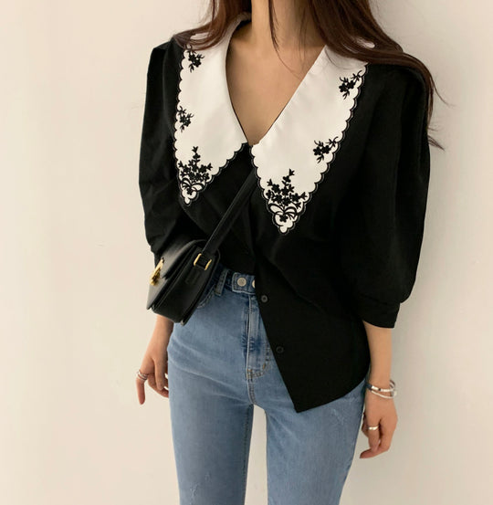 Our luxury shirt featuring a embroidery on the lapel and puffed sleeves is for sure a show stopper. Embroidered shirts are all year round clock best sellers. From a day occasion to a get-together, puff sleeves just add a perfect touch to the aesthetics of the overall look.