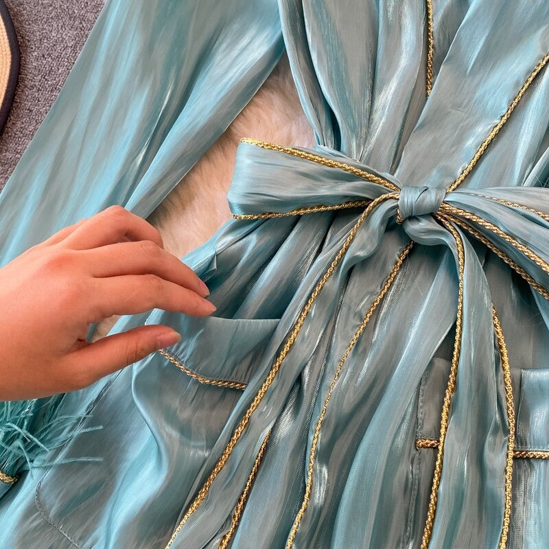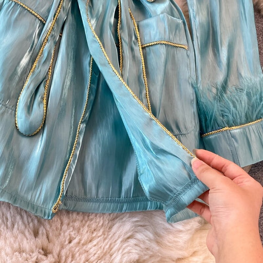 Our satin blouse featuring feathered sleeves with golden lining and a waist belt is for sure a show stopper. Blouses are all year round clock best sellers. From a day occasion, tonight's get-together our Vintage featuring a bandage wrap-around pattern with golden lining and a waist belt just adds a touch to the overall look's aesthetics.