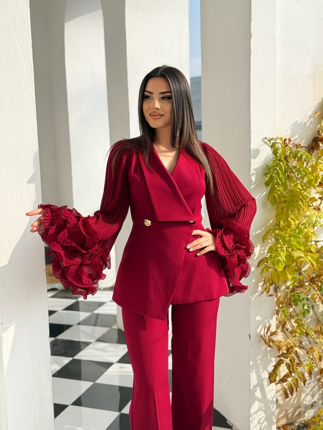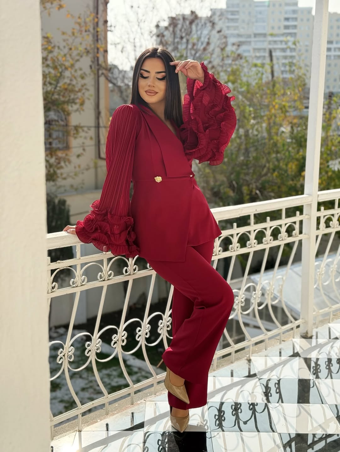 Our coordinated set featuring pleated organza sleeves with embellished button detailing is for sure a show stopper. Pants Set are all year round-the-clock best sellers. From a day occasion to a night get-together, the embellished pattern just adds a touch to the aesthetics of the overall look.