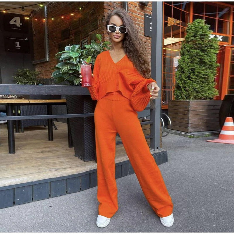 Our solid track set featuring wide-legged pants and long sleeves, round neck design top is for sure a show stopper. Tracksuits are all-year round-the-clock best sellers. The ribbed fabric and the lapel pattern add a touch to the aesthetics of the overall look.
