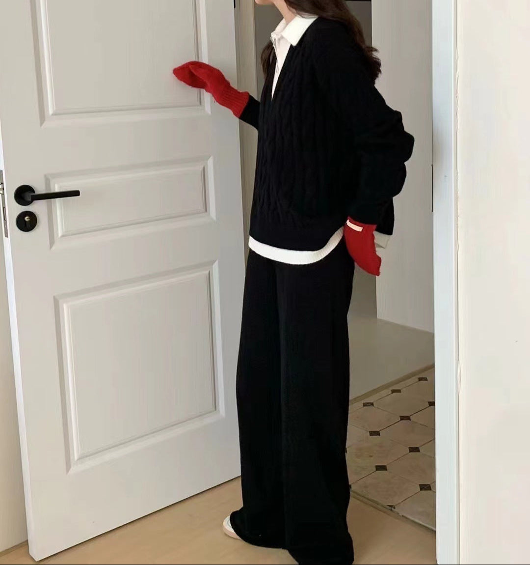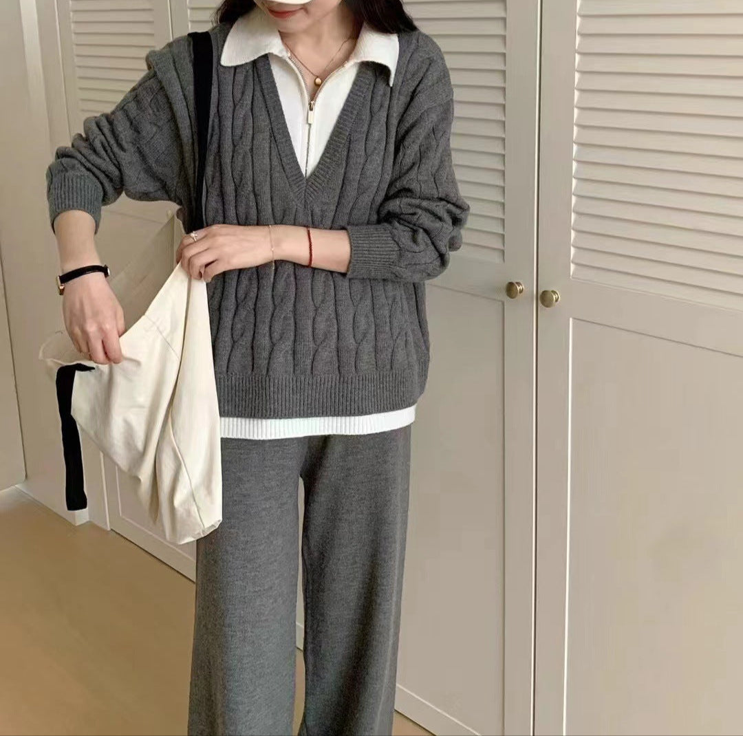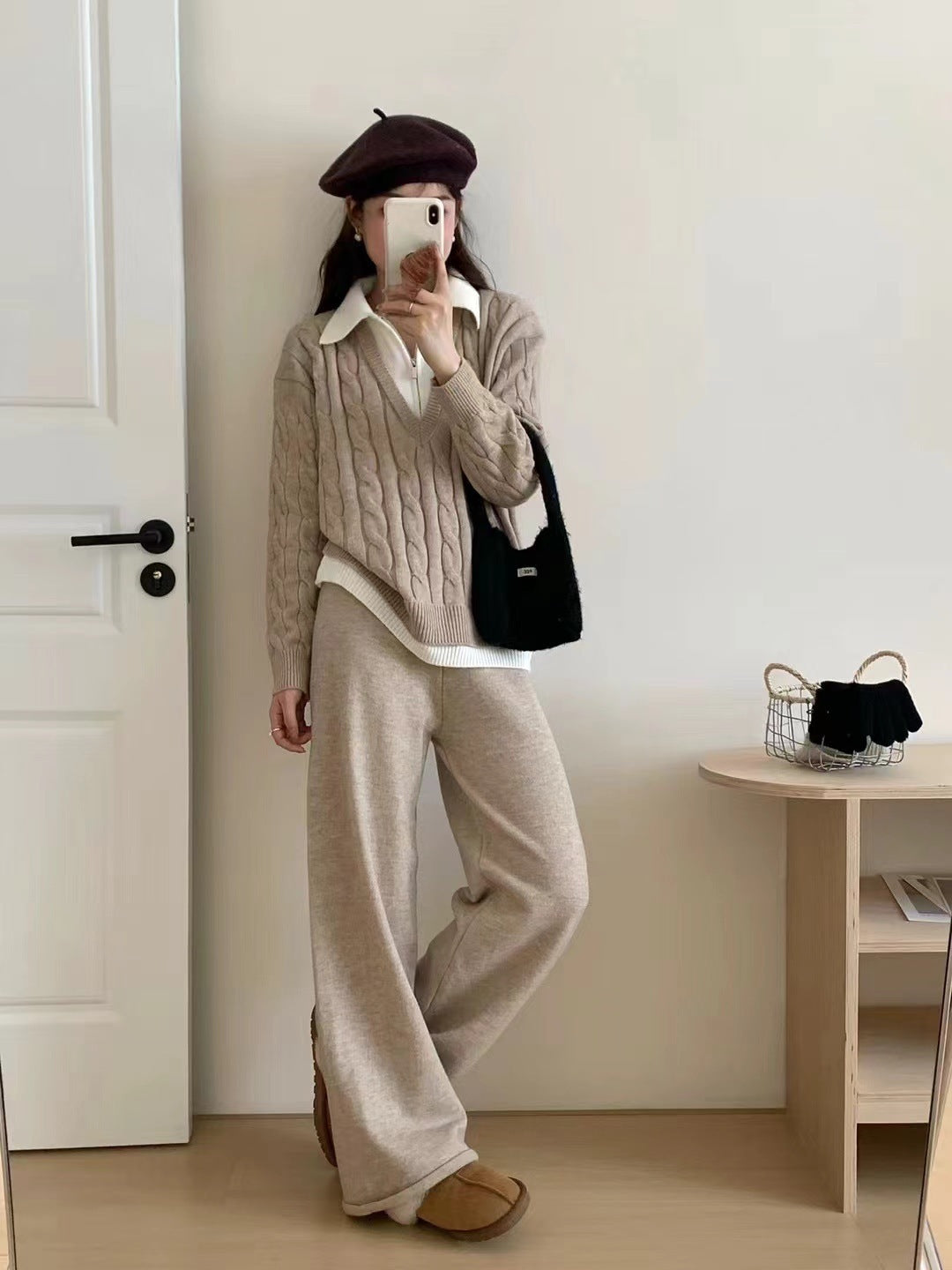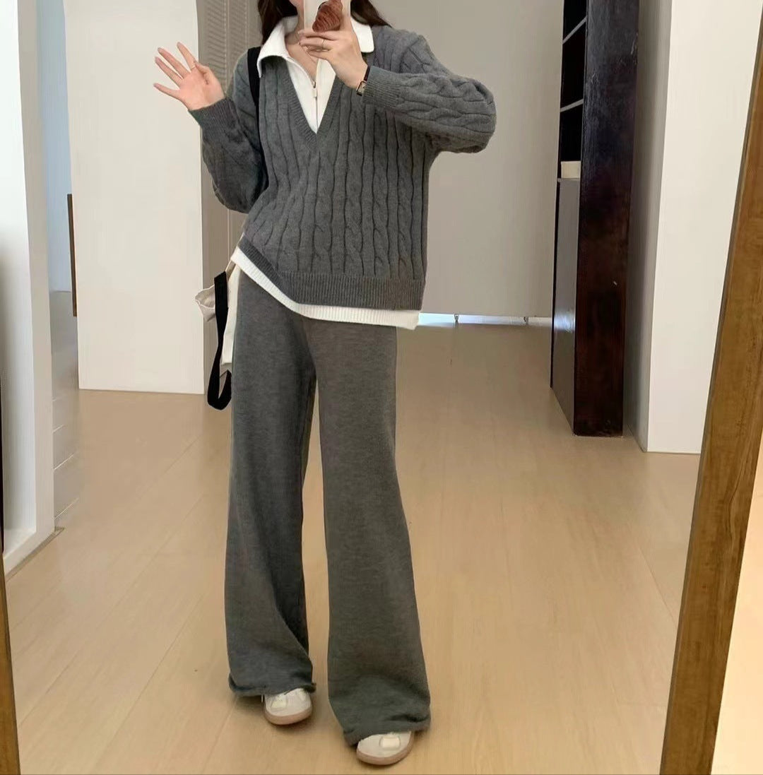 Our solid track set featuring wide-legged pants and contrasting collar Pullover is for sure a show stopper. Tracksuits are all-year round-the-clock best sellers. The classic soft wool fabric and the lapel pattern add a touch to the aesthetics of the overall look.