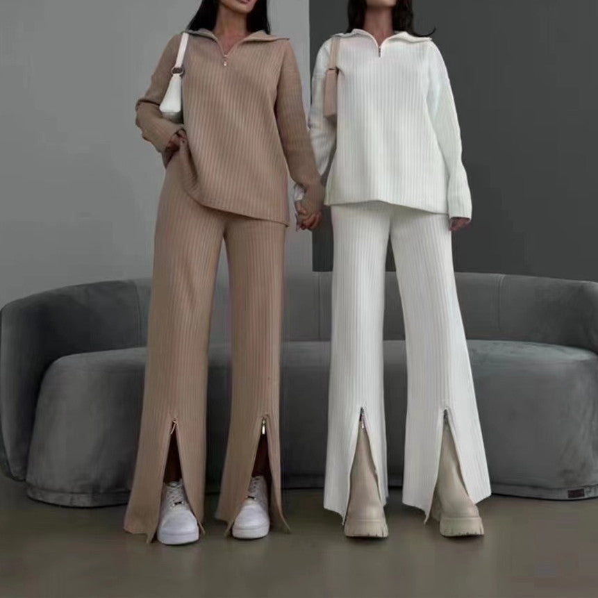 Features: flared pants, draped blouse, shoulder padding