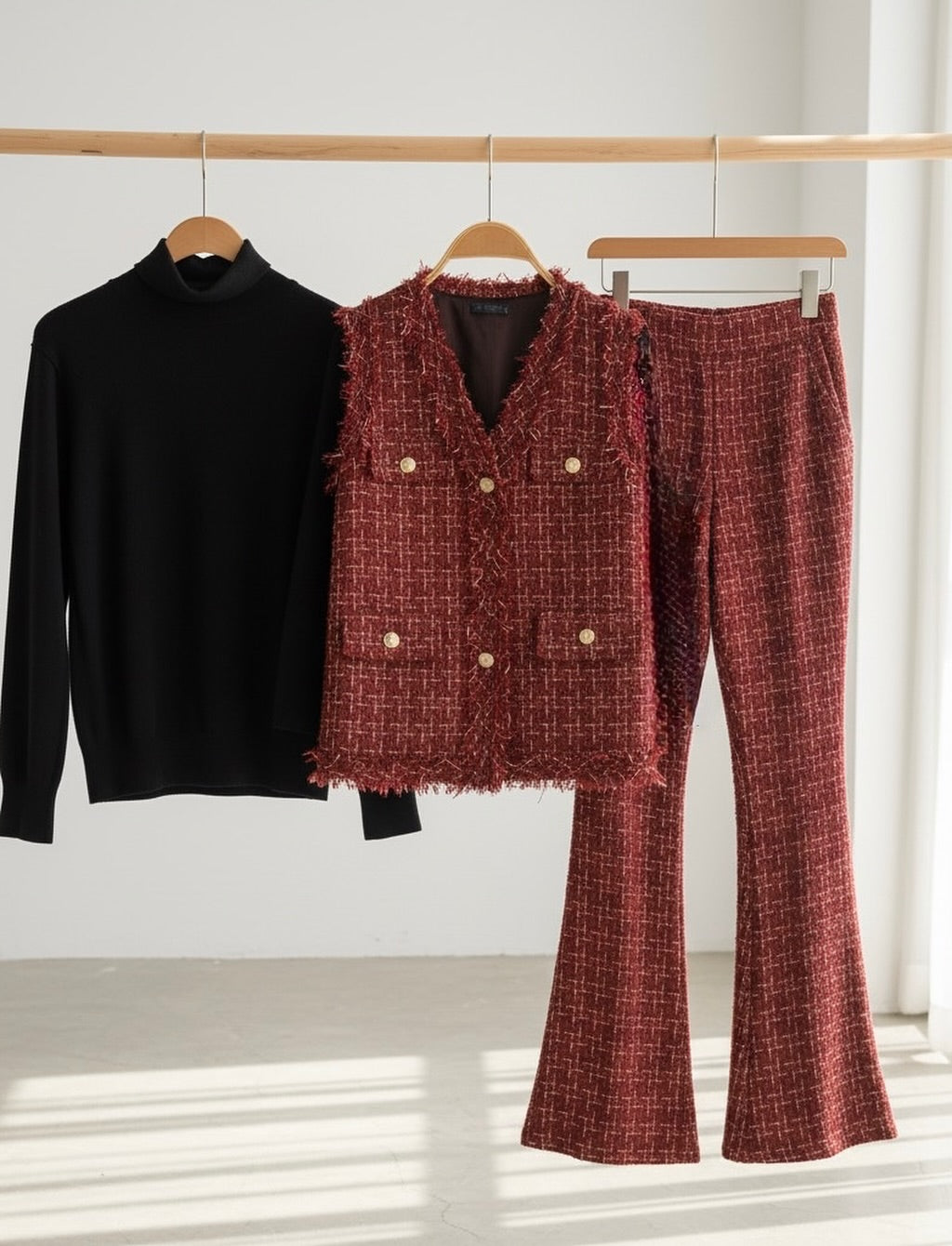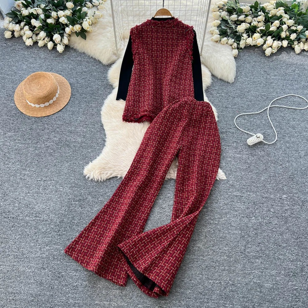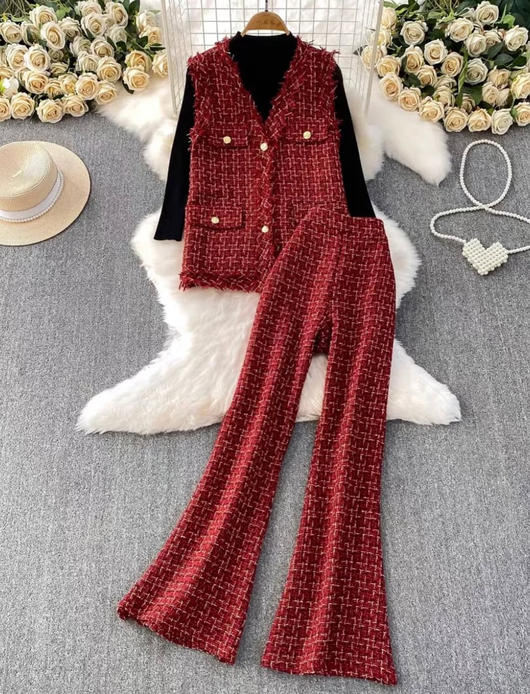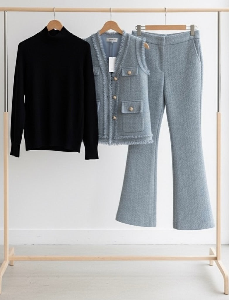 Our checkered tweed track set featuring coordinating pants and high neck camisole,with Coordinated Jacket is for sure a show stopper. Tracksuits are all-year round-the-clock best sellers. The Tweed pattern adds a touch to the aesthetics of the overall look.