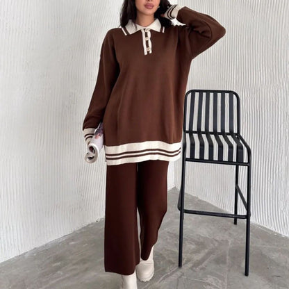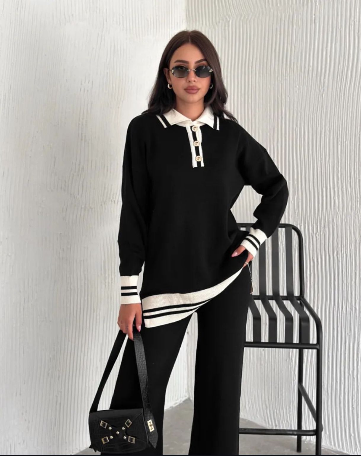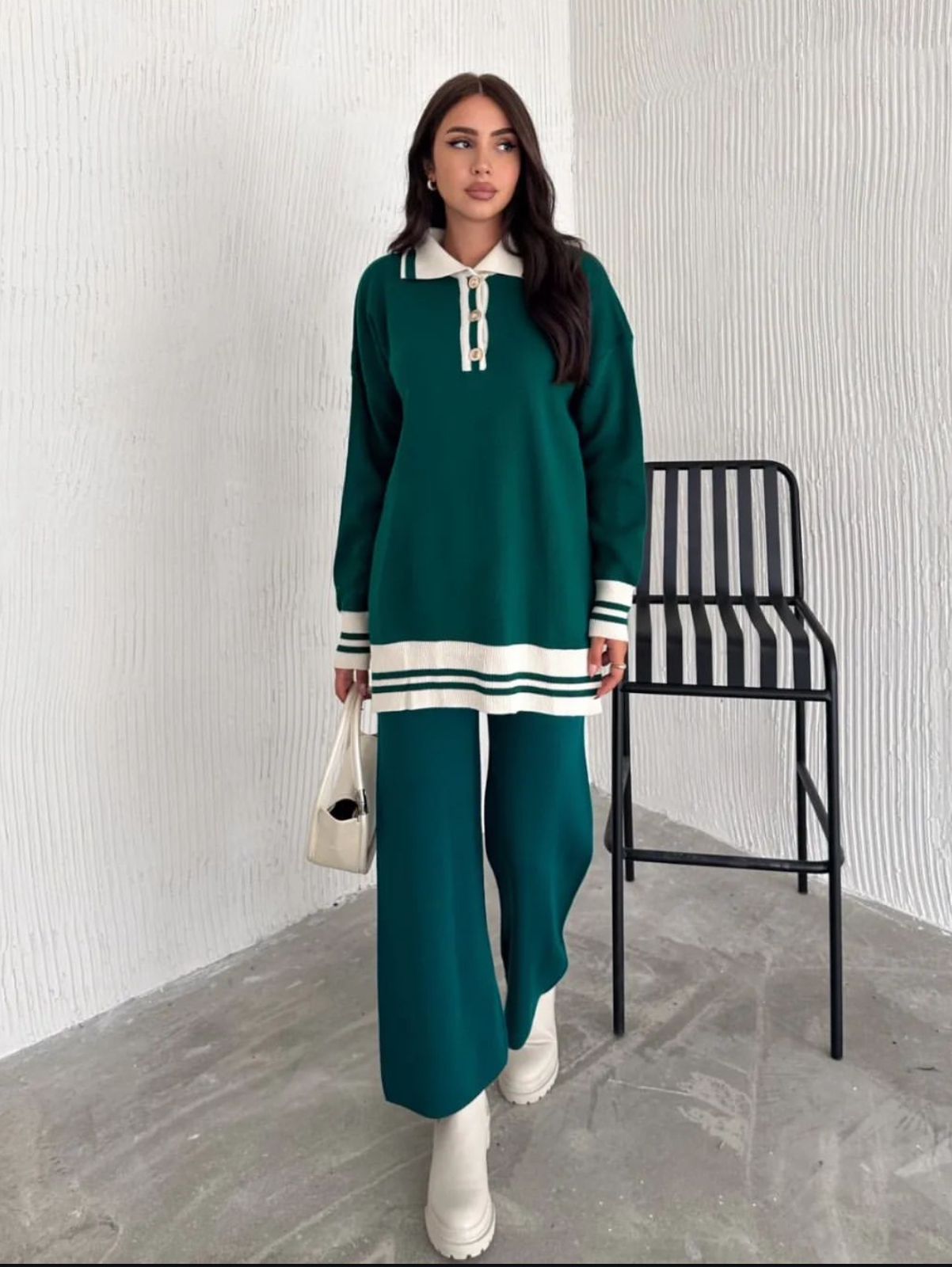 Our solid track set featuring wide-legged pants and long sleeves, button down collar Woolen Sweater is for sure a show stopper. Tracksuits are all-year round-the-clock best sellers. The ribbed pattern adds a touch to the aesthetics of the overall look.