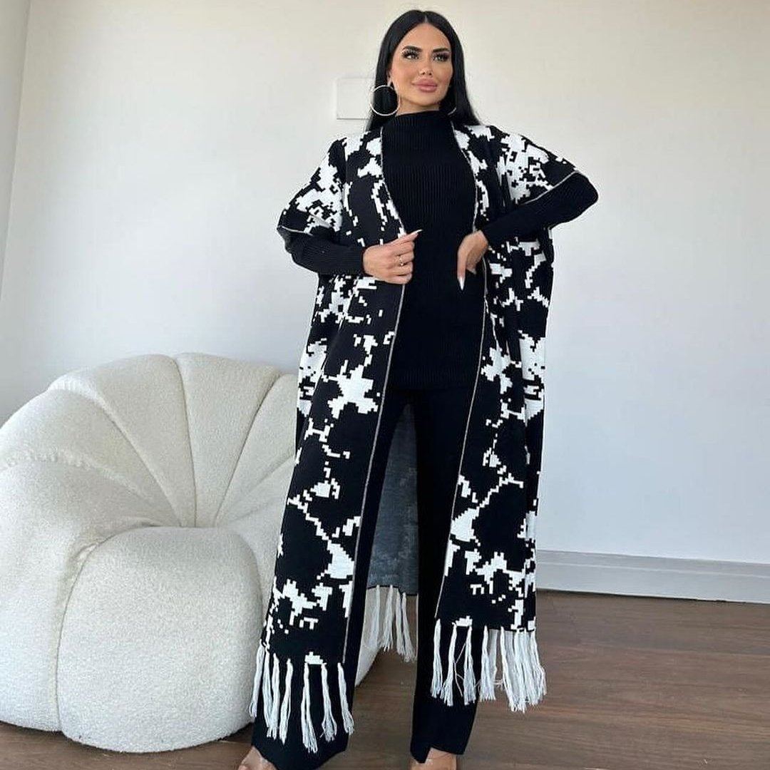 Our solid luxury three-piece set featuring a vest and a cover up and pants is for sure a show stopper. Tracksuits are all-year round-the-clock best sellers. The knitting pattern and the vest add a touch to the aesthetics of the overall look.