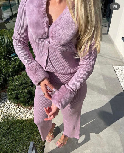Our solid track set featuring wide-legged pants and with coordinated cardigan with fur on both collar and sleeves, button closure in ribbed detailing is for sure a show stopper. Tracksuits are all-year round-the-clock best sellers. The ribbed pattern adds a touch to the aesthetics of the overall look.