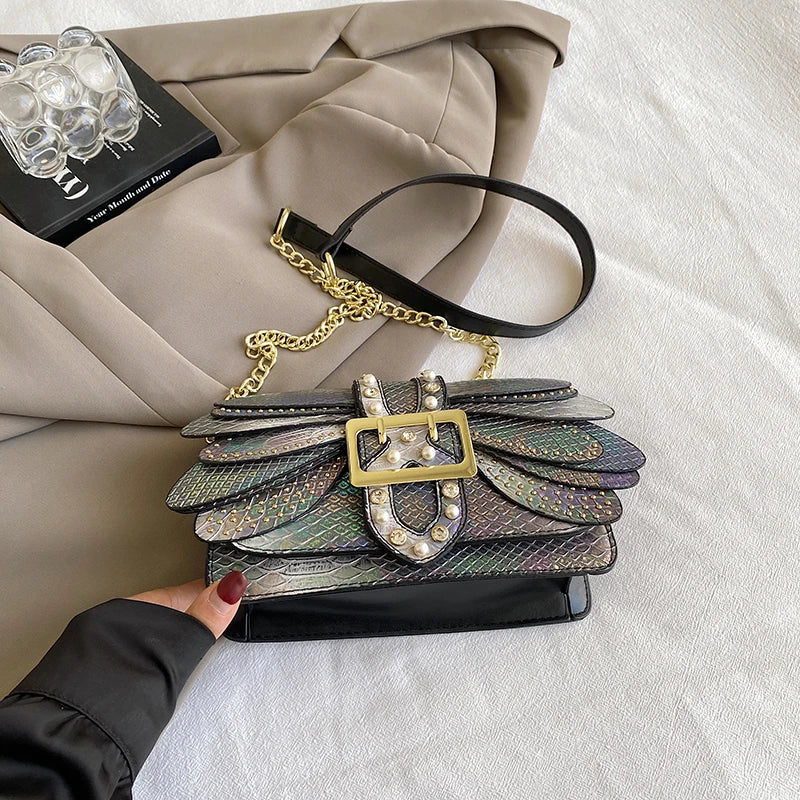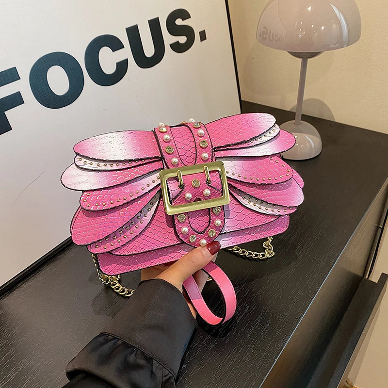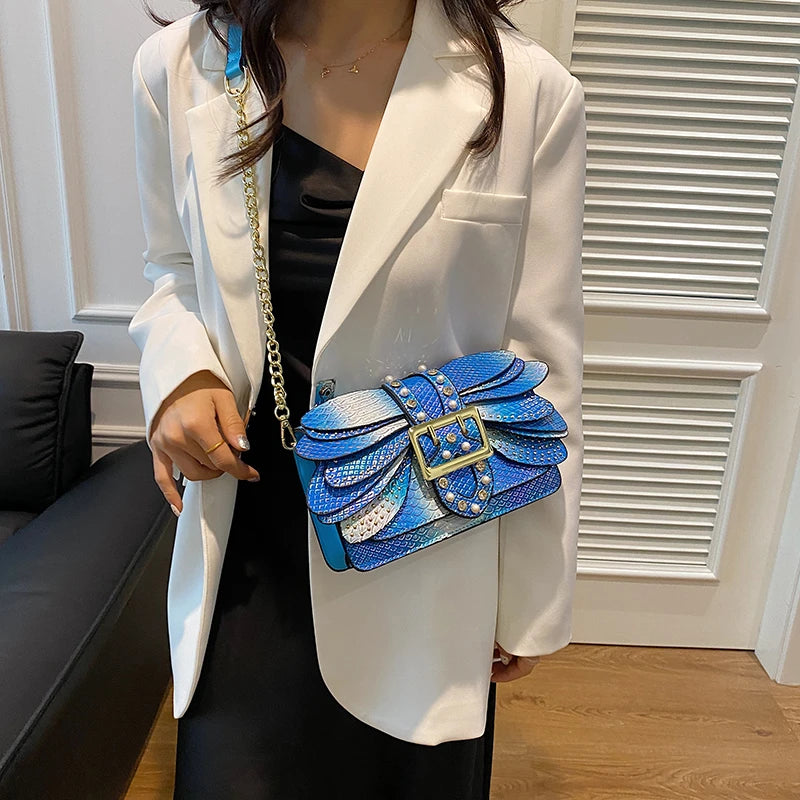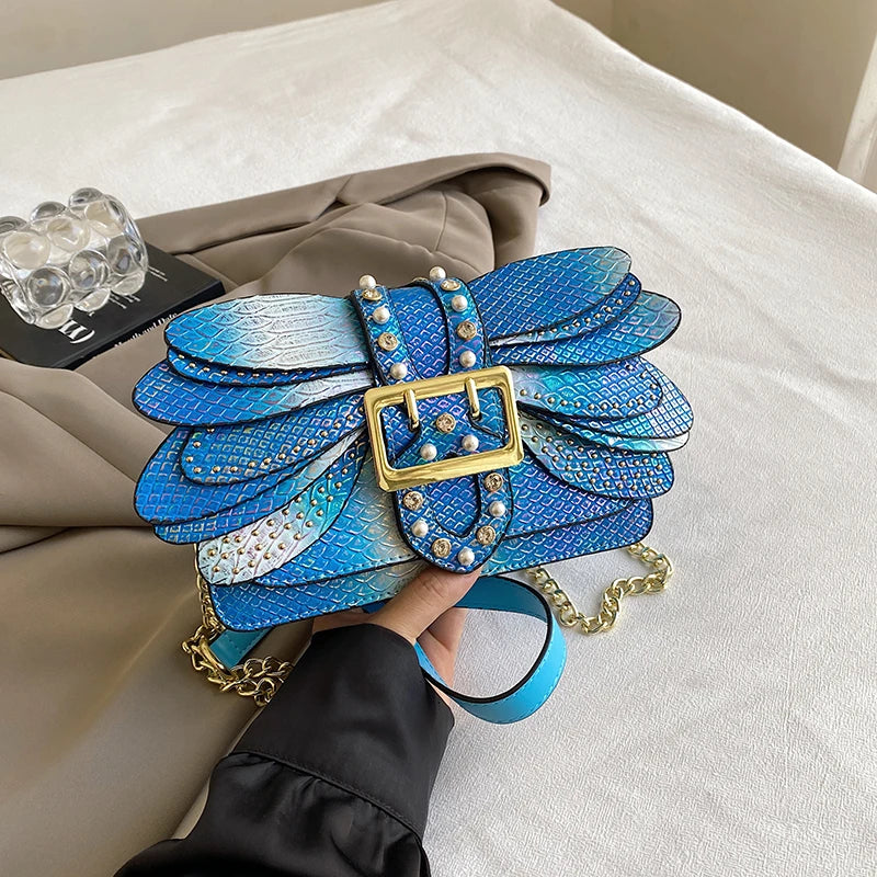 • designed on a rectangular metal frame, this bag features a butterfly pattern with rhinestone detailings