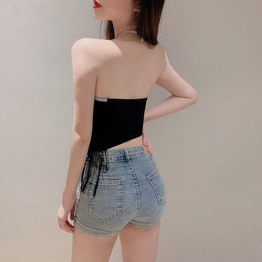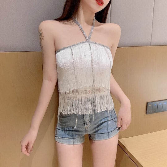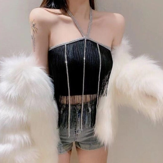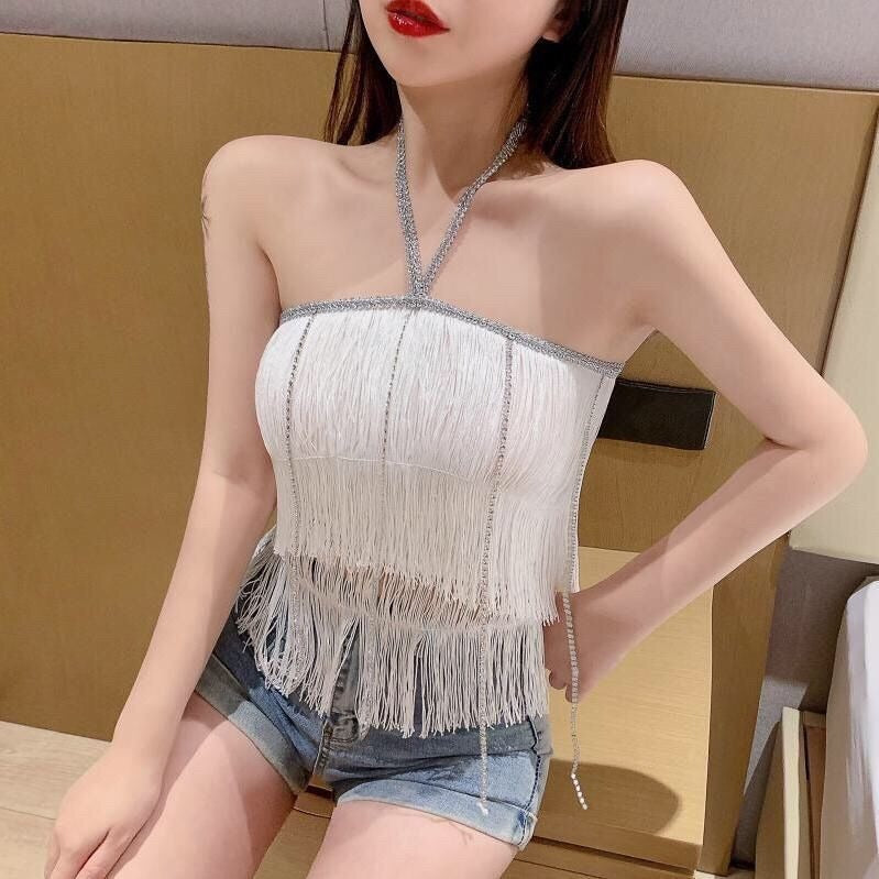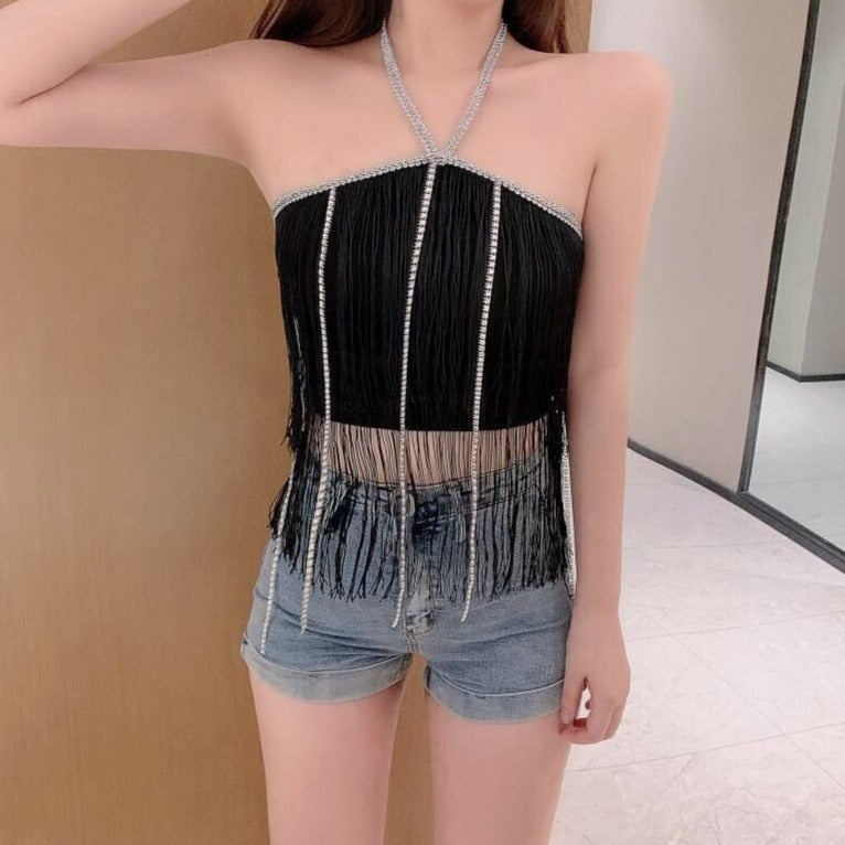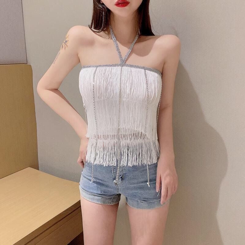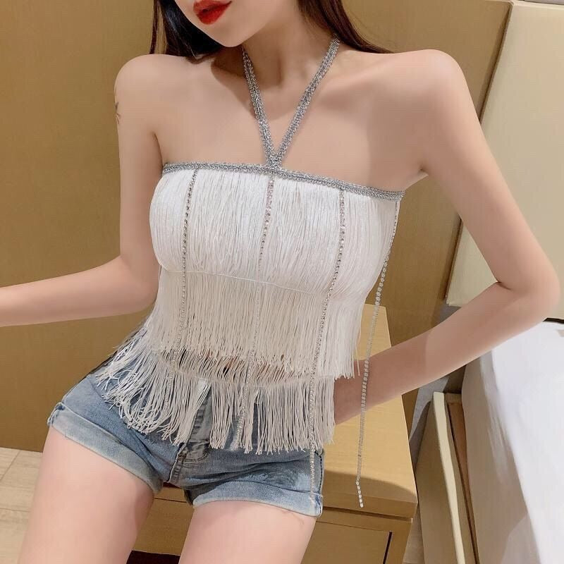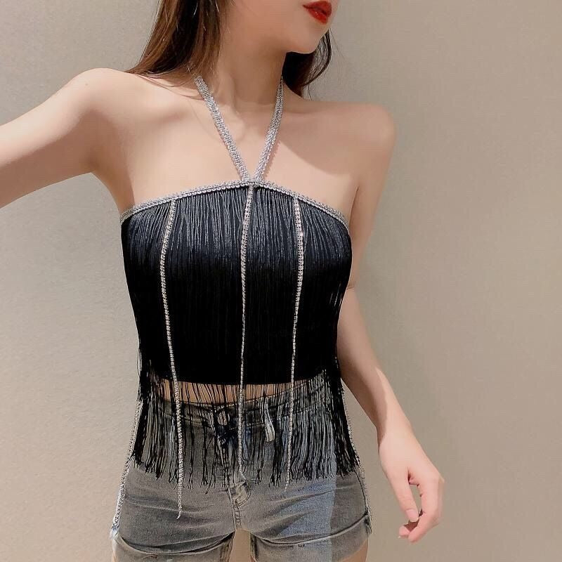 Bringing monotone bustier tops featuring tassel detailing and rhinestones in knitted fabric. The Bustier tops are the new trendsetters. From a day occasion or a night get-together, they are the perfect fit. Our bustier top featuring the tassel detailing just adds a touch to the aesthetics of the overall look.