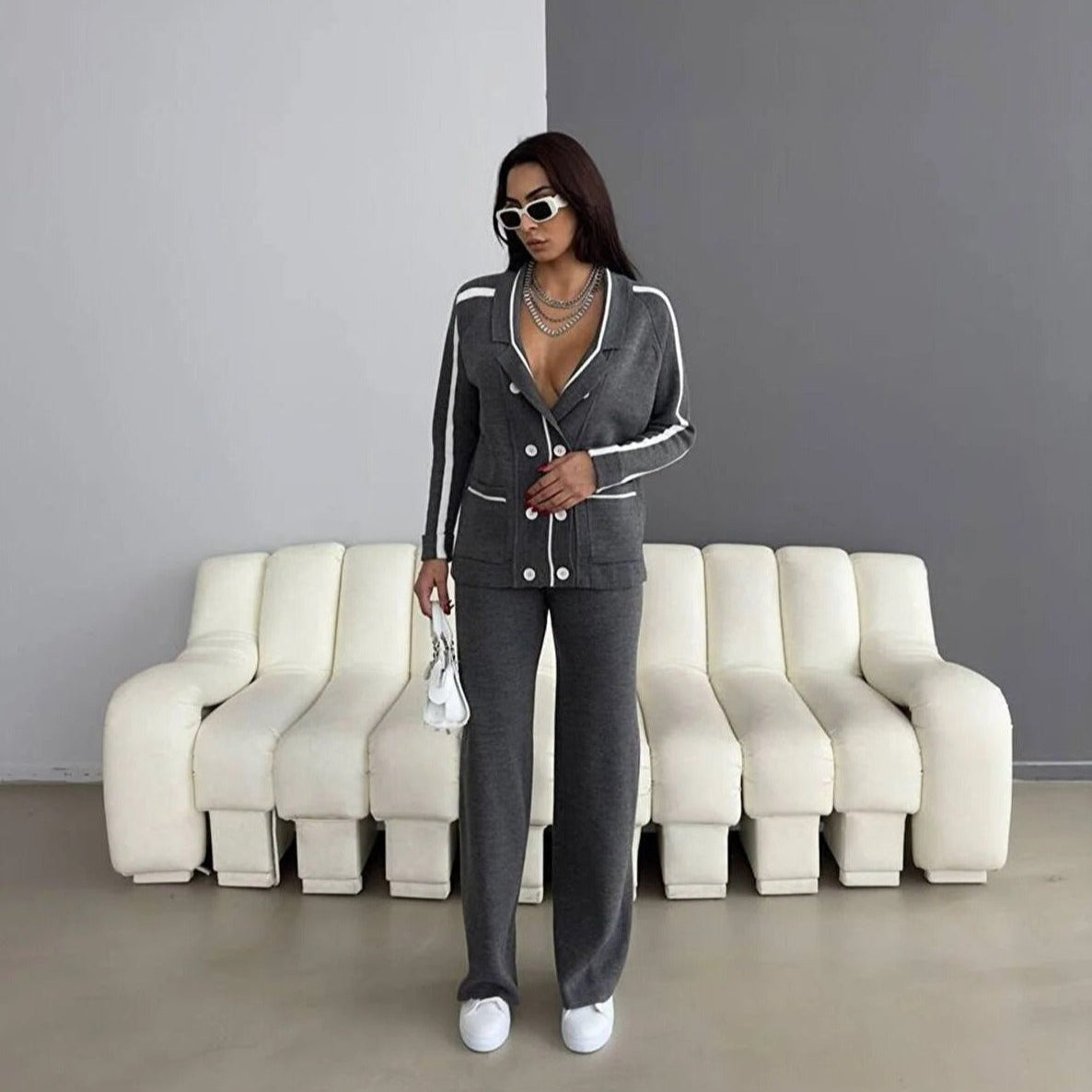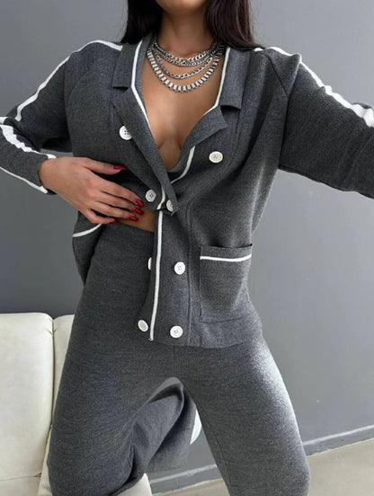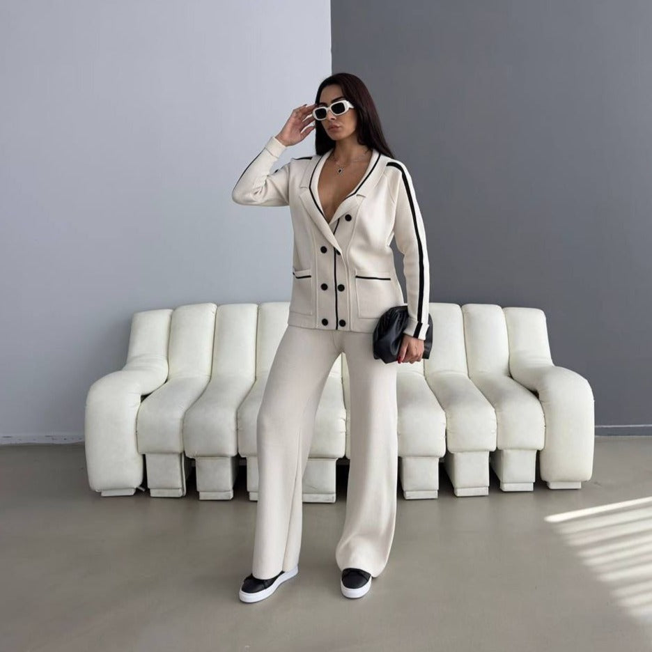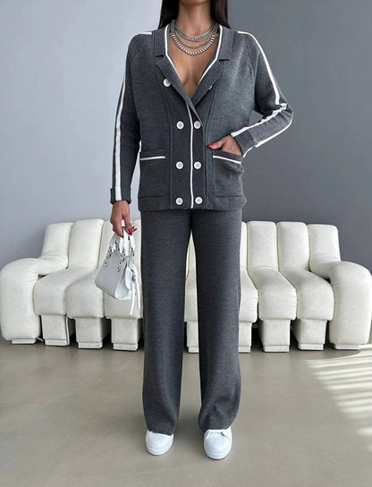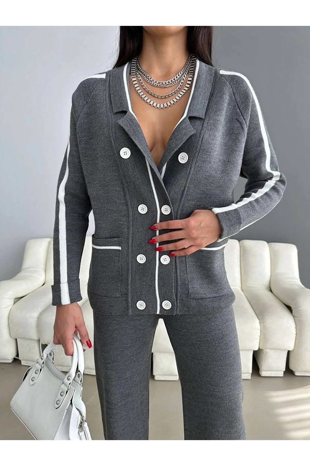 Our solid track set featuring wide-legged pants and long sleeves, round neck design top is for sure a show stopper. Tracksuits are all-year round-the-clock best sellers. The ribbed fabric and the lapel pattern add a touch to the aesthetics of the overall look.