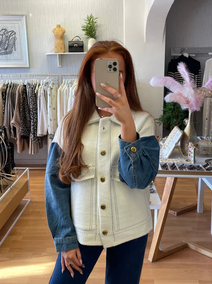 Our Monotone Cardigan featuring a classic lapel with contrasting Denim Sleeves is for sure a show stopper. Monotone cardigan are all year round clock best sellers. From a day occasion to a get-together, contrasting denim sleeves just adds a perfect touch to the aesthetics of the overall look.