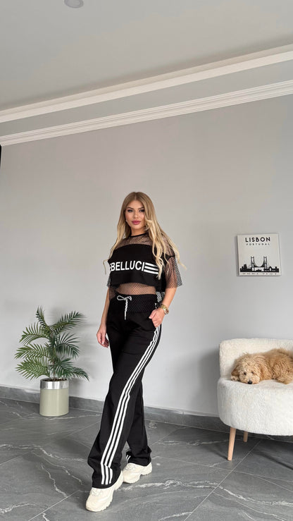 Our solid coordinated set with a baggy style Mesh top and joggers featuring a layered print is for sure a show stopper. Co-ord sets are all-year round-the-clock best sellers. From a day occasion to a night get-together, the printed layer detailing just adds a touch to the aesthetics of the overall look.