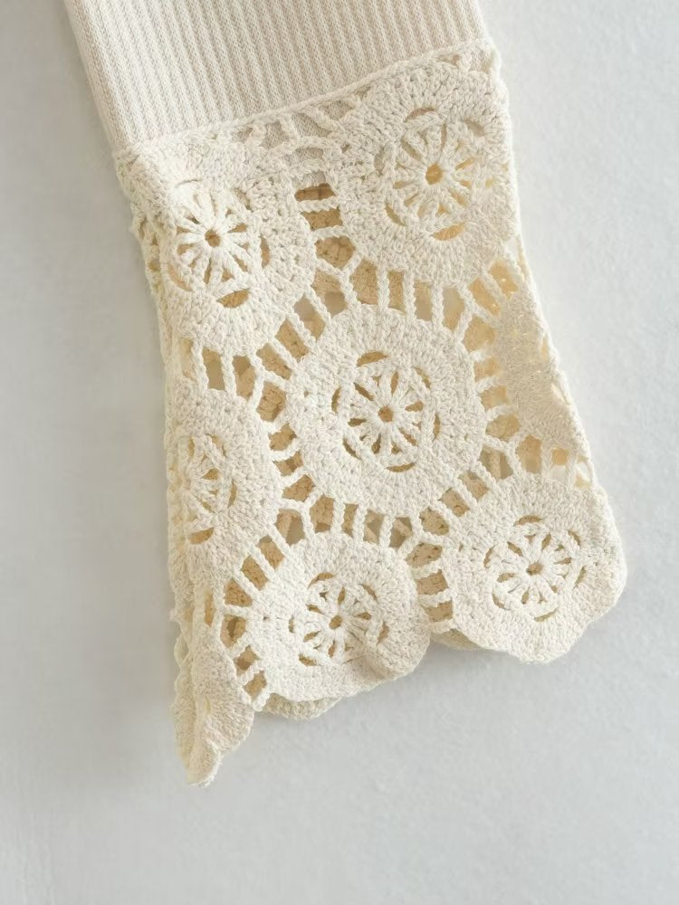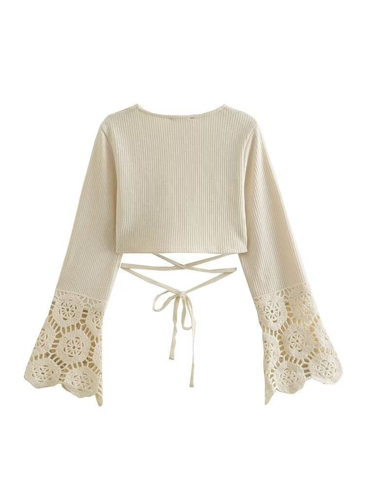 features: high-rise slit and shirt featuring the tied waist and crochet detailing