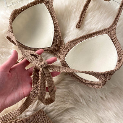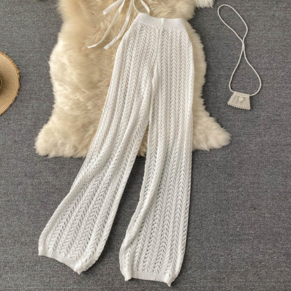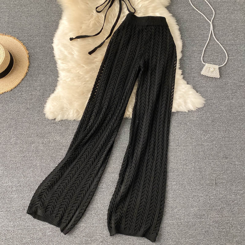 Our Crochet two-piece set including a bikini featuring crochet pants are a must-add outfit to your beach or swimwear. From a day at the beach or a pool party, our crochet set just adds a touch to the aesthetics of the overall look.