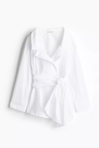 Our White shirt featuring a structured poplin wrap is for sure a show stopper. Poplin blouses are all year round clock best sellers. From a day occasion, tonight's get-together, the wrap around detailing just adds a touch to the overall look's aesthetics.