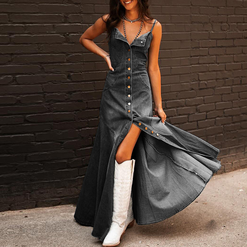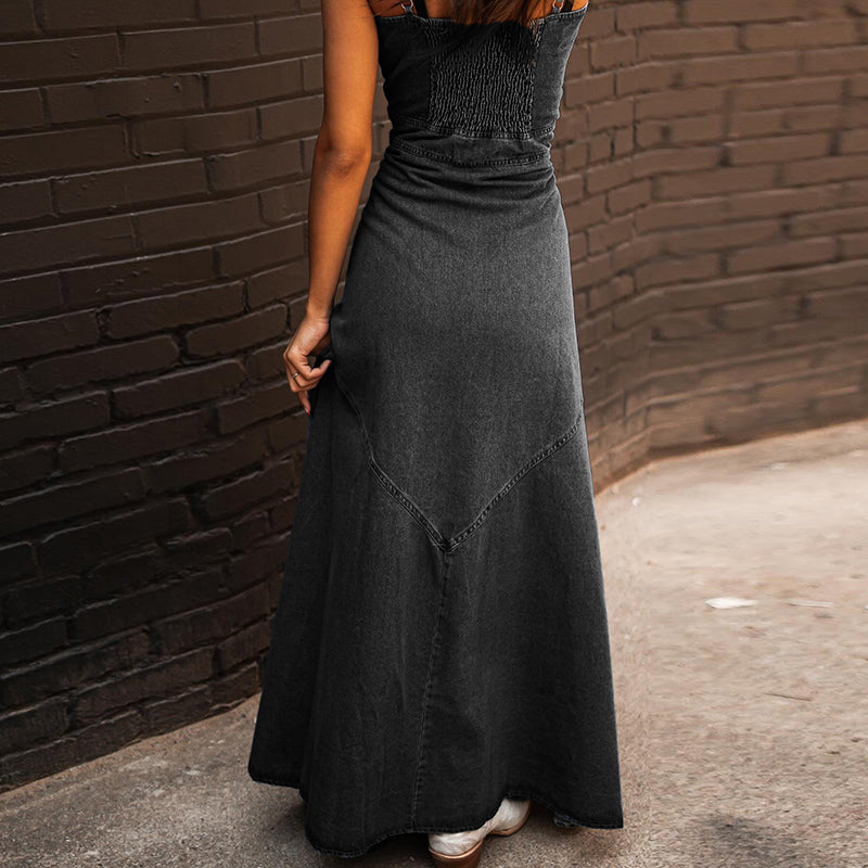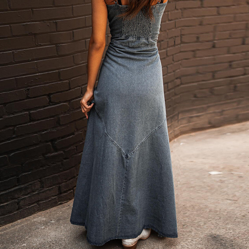 Our Long Sleeveless Midi Dress in Denim fabric with button down detailing is for sure a show stopper. Midi Dresses are all year round-the-clock best sellers. From a day occasion to a night get-together, The vintage classic denim just adds a touch to the aesthetics of the overall look.