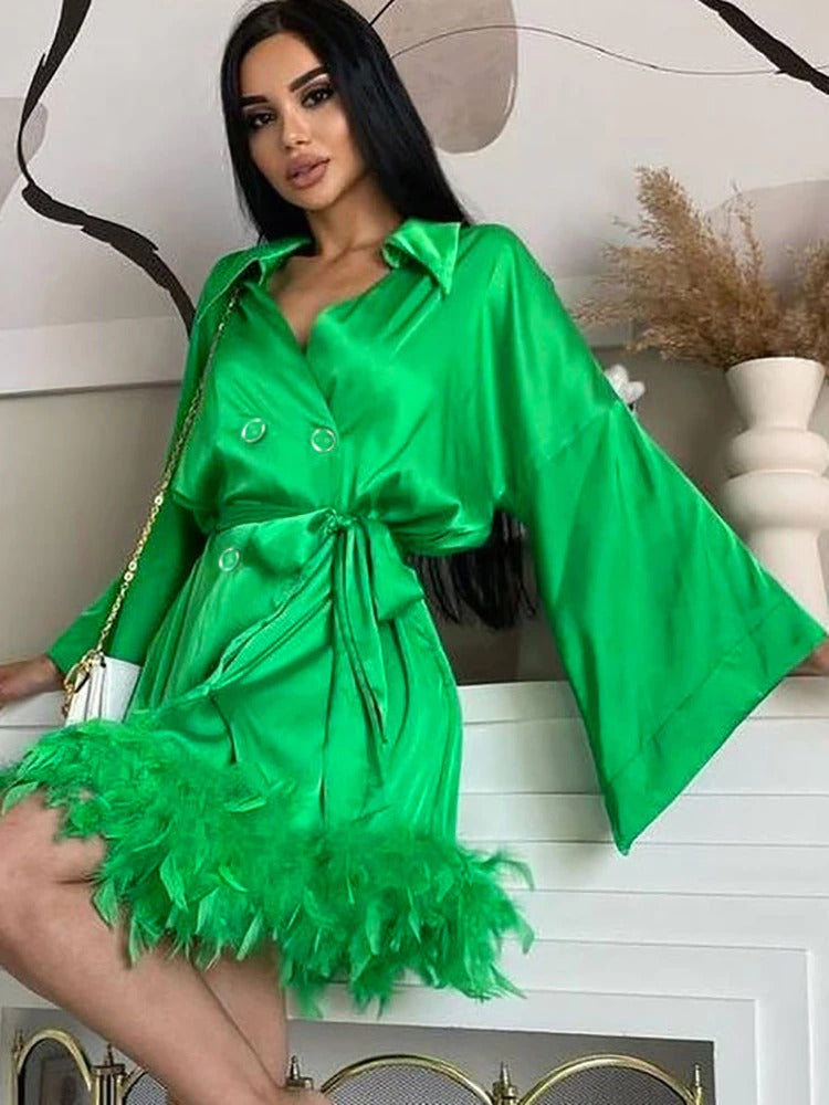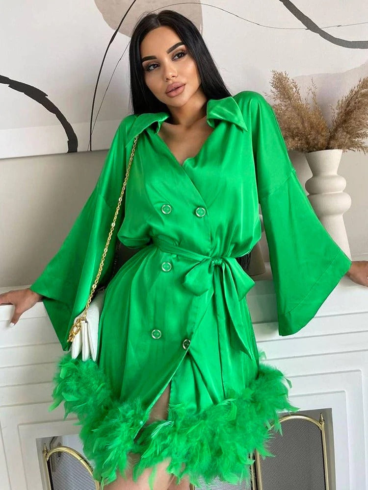 Our satin dress featuring feathered hem with button detailing and a waist belt is for sure a show stopper. Satin Dresses are all year round clock best sellers. From a day occasion, tonight's get-together our Vintage featuring a bandage wrap-around pattern with feathered hem and a waist belt just adds a touch to the overall look's aesthetics.