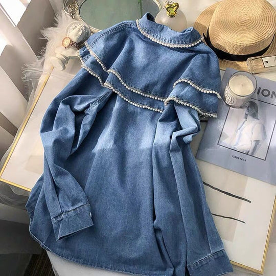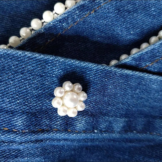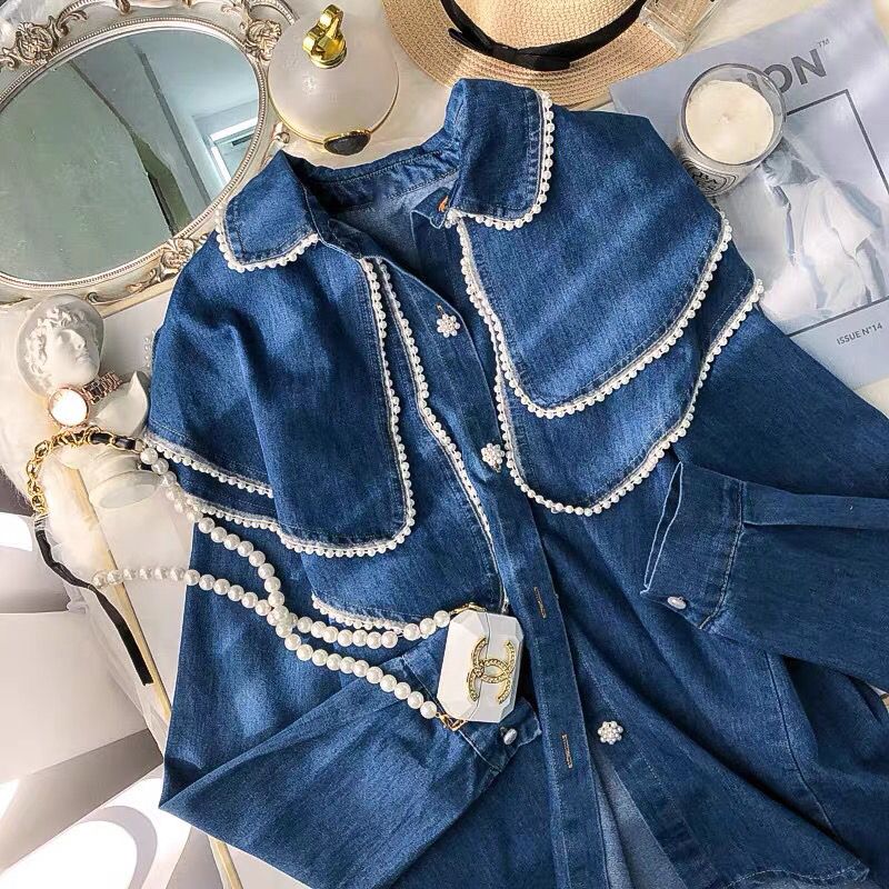 Our statement denim blouse featuring french vintage collar and pearl detailing is for sure a show stopper. Long Blouses are all year round clock best sellers. From a day occasion, tonight's get-together the french collar detailing with pearl work just adds a touch to the overall look's aesthetics.