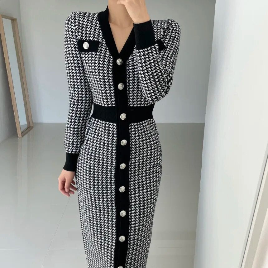 Our Bodycon dress in the imported knitted fabric featuring a hound's tooth pattern in long button down dress, long sleeves and button closure is for sure a show stopper. Bodycon Dresses are all-year round-the-clock best sellers. From an outdoor get-together to a comfortable look, these dresses are the perfect fit. The fusion of the sporty look and the hound's tooth pattern just adds a touch to the aesthetics of the overall look.