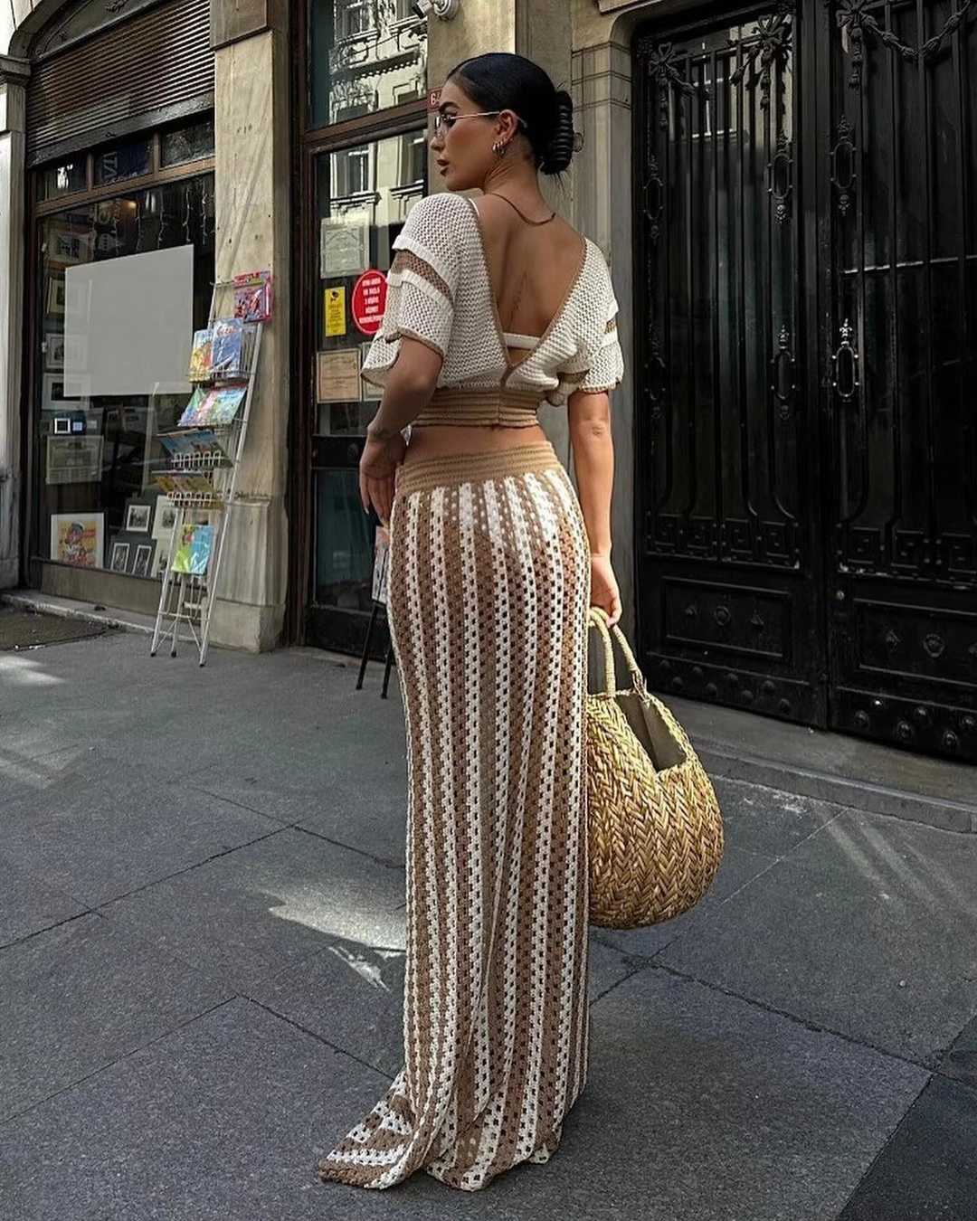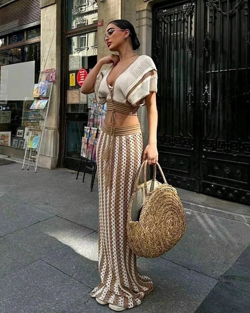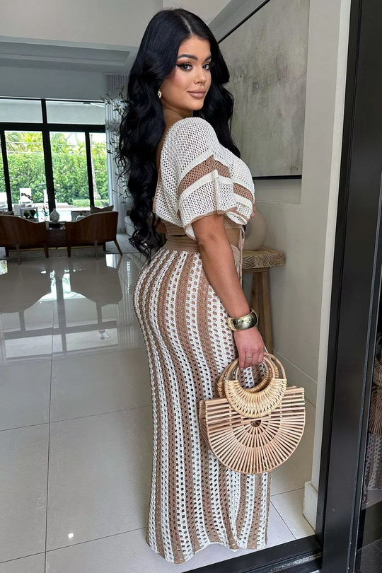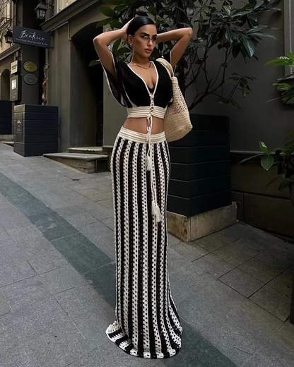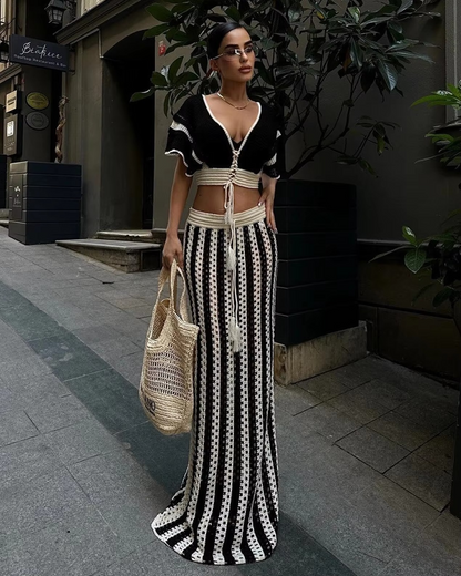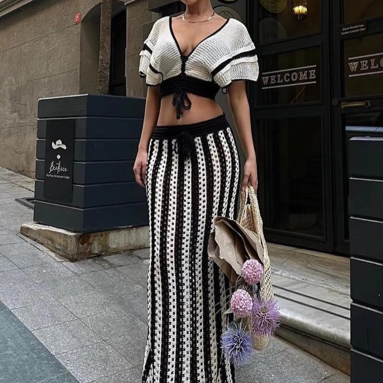 Our contrasting crochet two-piece set including a bikini featuring lace up detailing and crochet skirt are a must-add outfit to your beach or swimwear. From a day at the beach or a pool party, our crochet set just adds a touch to the aesthetics of the overall look.